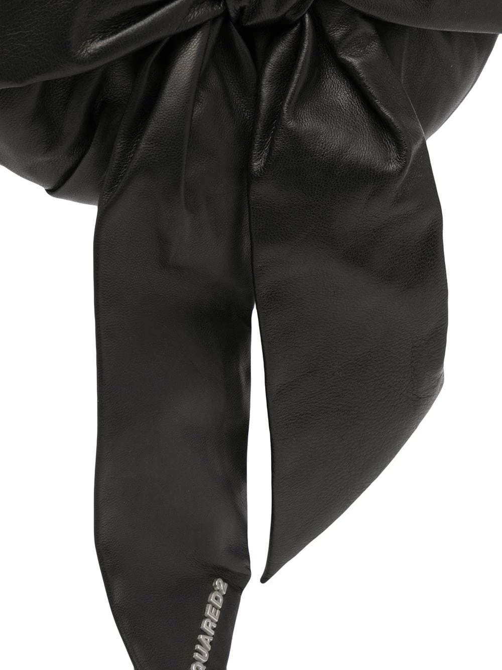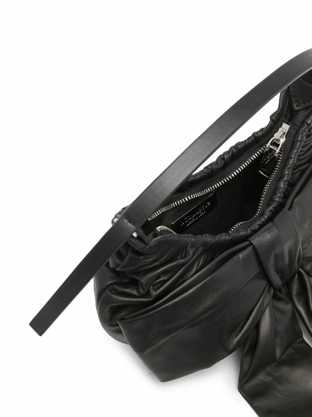 Nœud oversize, détails de fronces, anse ajustable, fermeture zippée sur le dessus, poche intérieure plaquée. Couleur : noir. Matière : cuir.