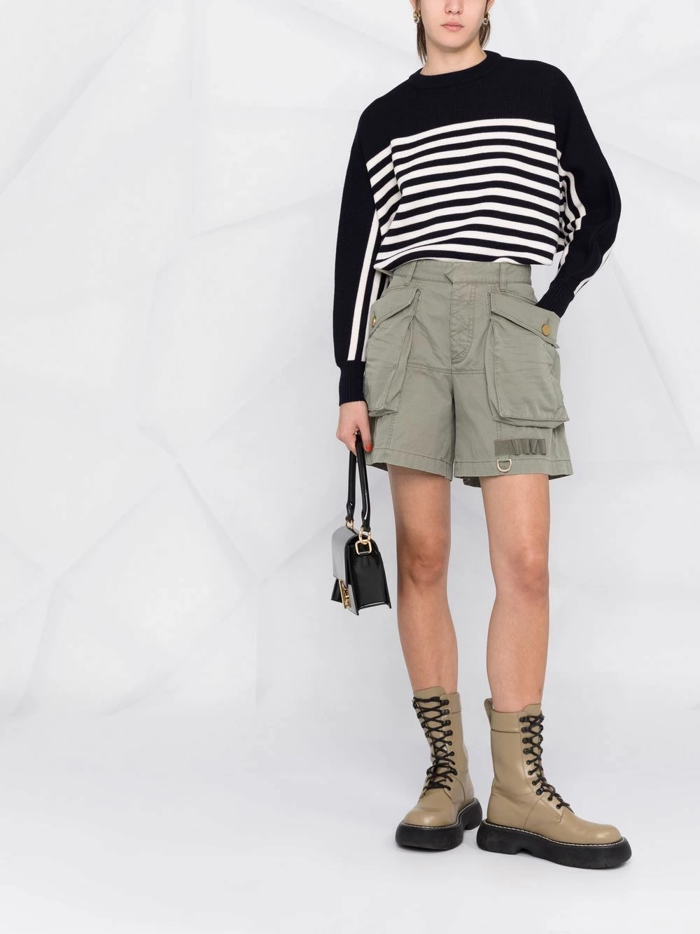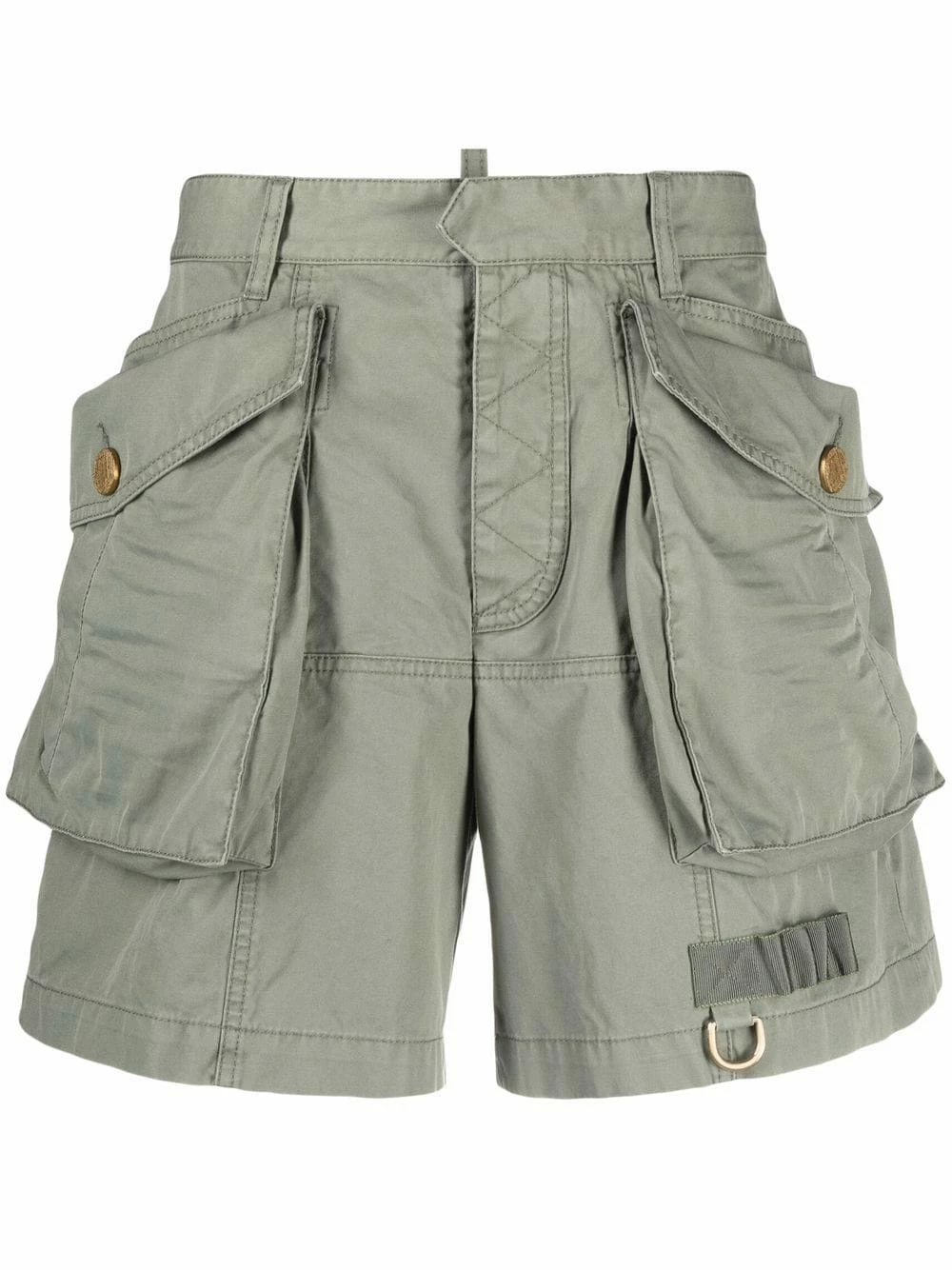 Taille haute, passants de ceinture, deux poches plaquées avant, fermeture dissimulée sur le devant. Couleur : vert. Matière : coton.