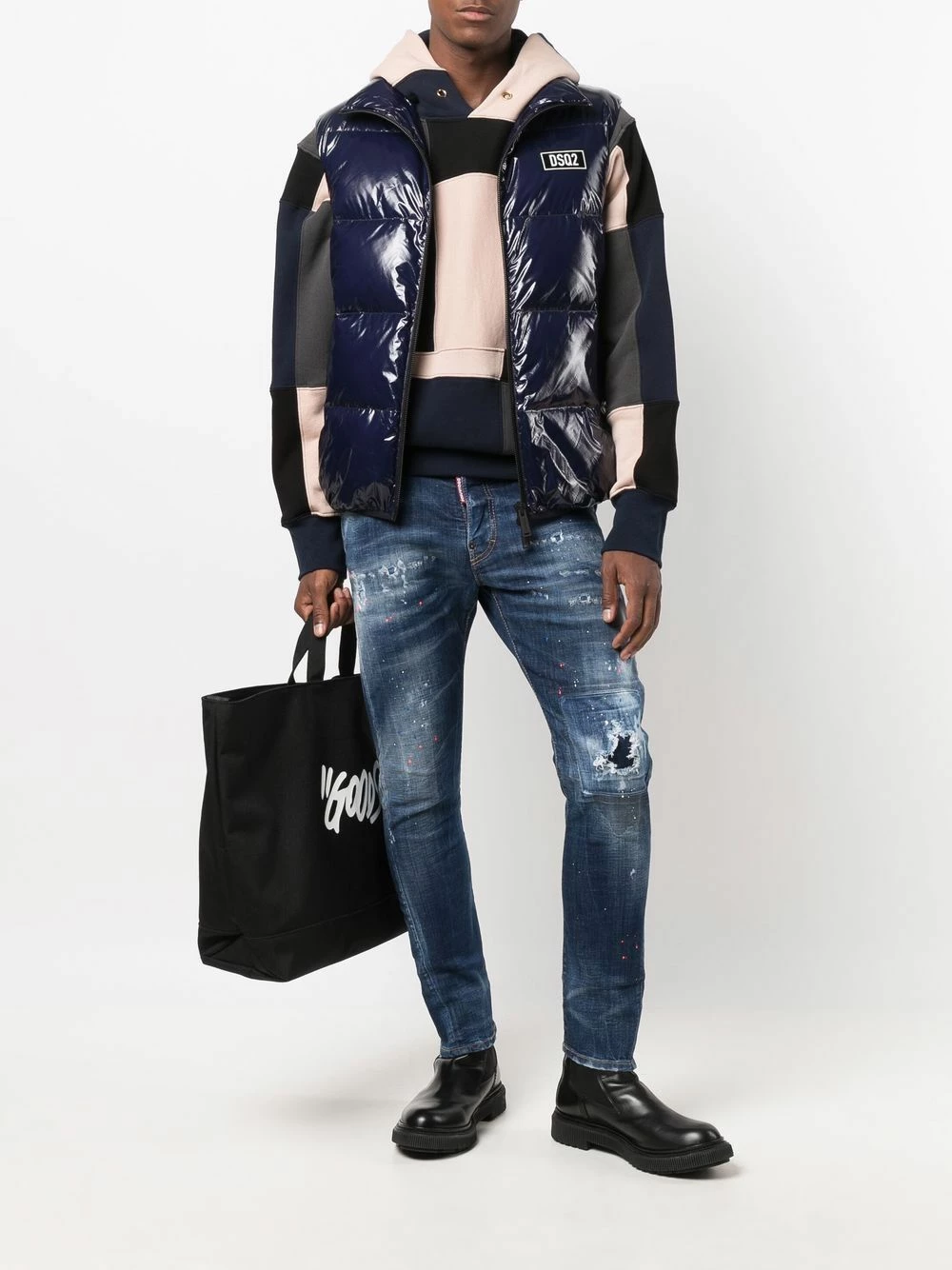 Garnissage en duvet, logo imprimé sur le devant, logo imprimé à l’arrière, design matelassé, fermeture zippée devant, design sans manches. Matière : duvet.
