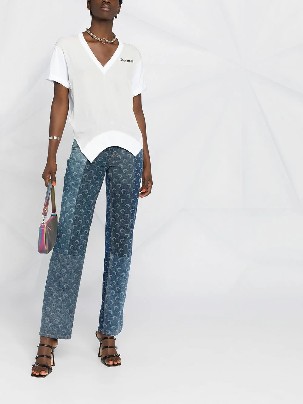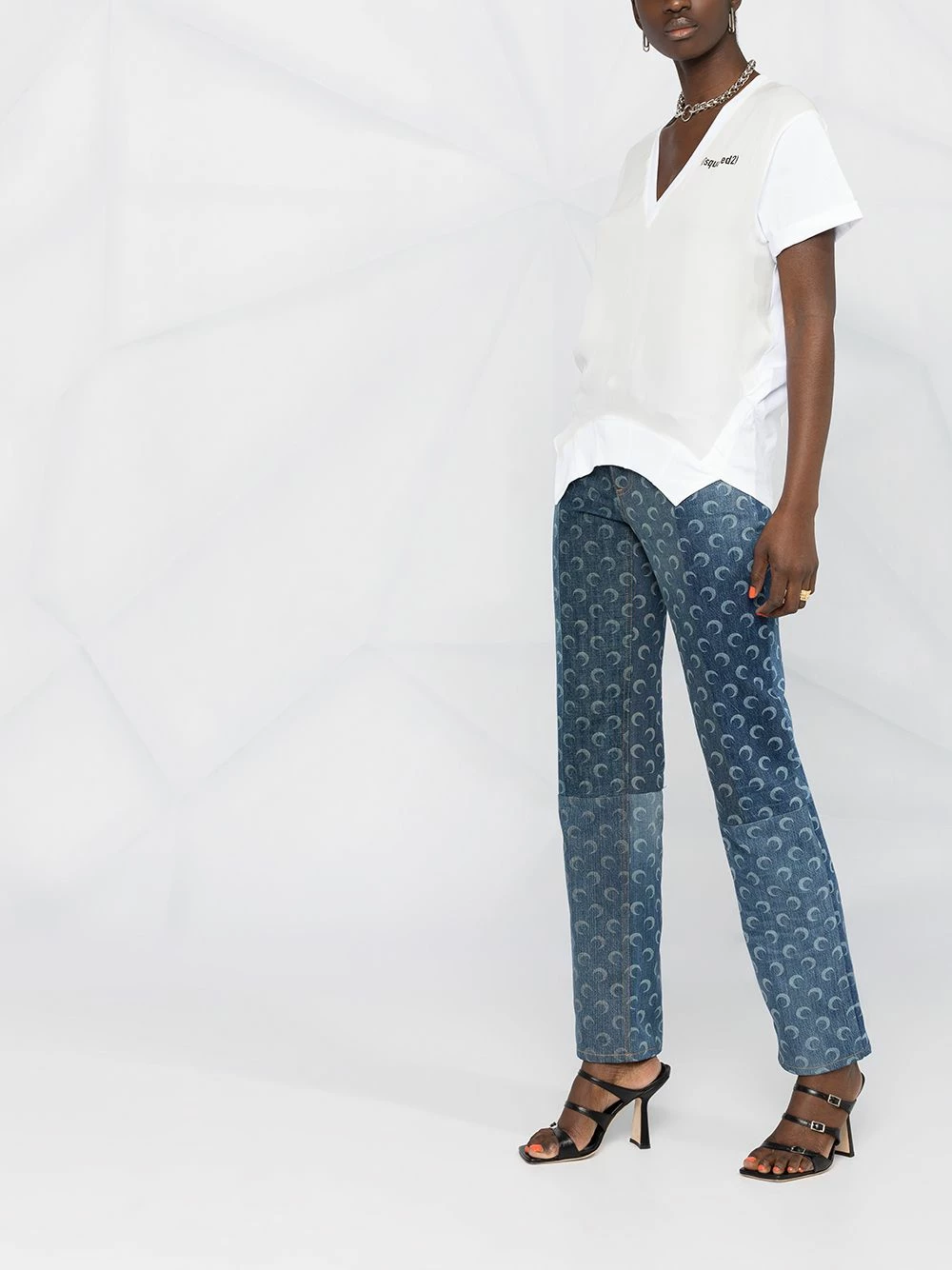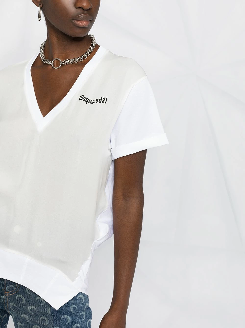 Logo imprimé à la poitrine, col v, manches courtes, ourlet incurvé. Couleur : blanc.