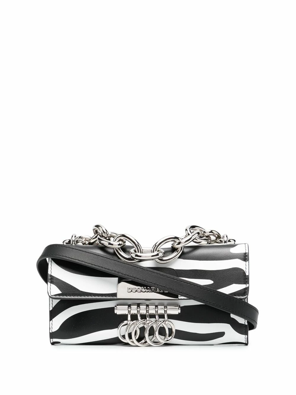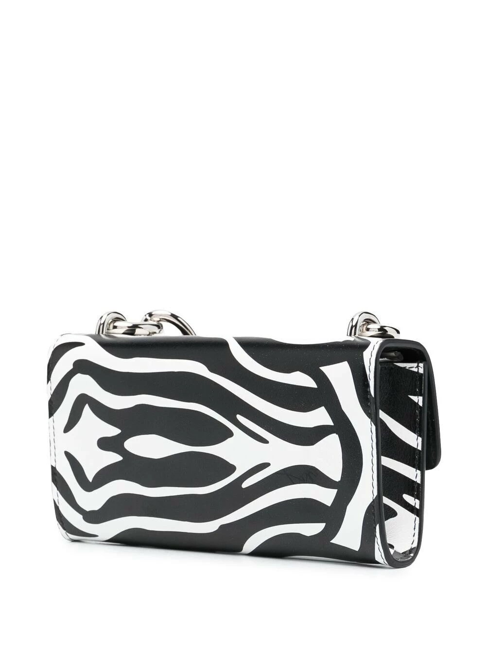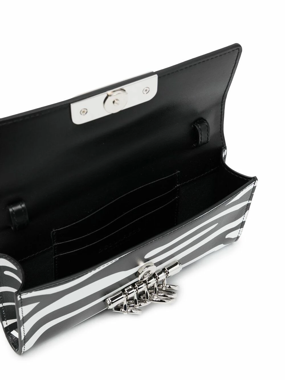 Logo gravé, ornements argentés, rabat sur le devant, fermeture à boutons pression, bride porté épaule détachable et ajustable, anse à maillons de chaîne, imprimé zèbre, compartiments intérieurs pour carte, logo imprimé à l’intérieur. Matière : cuir de veau.