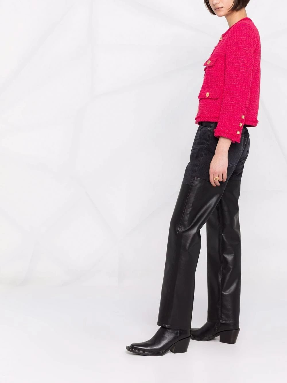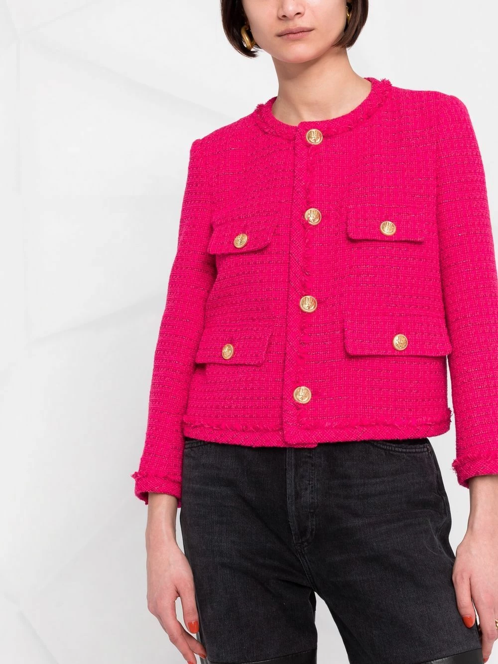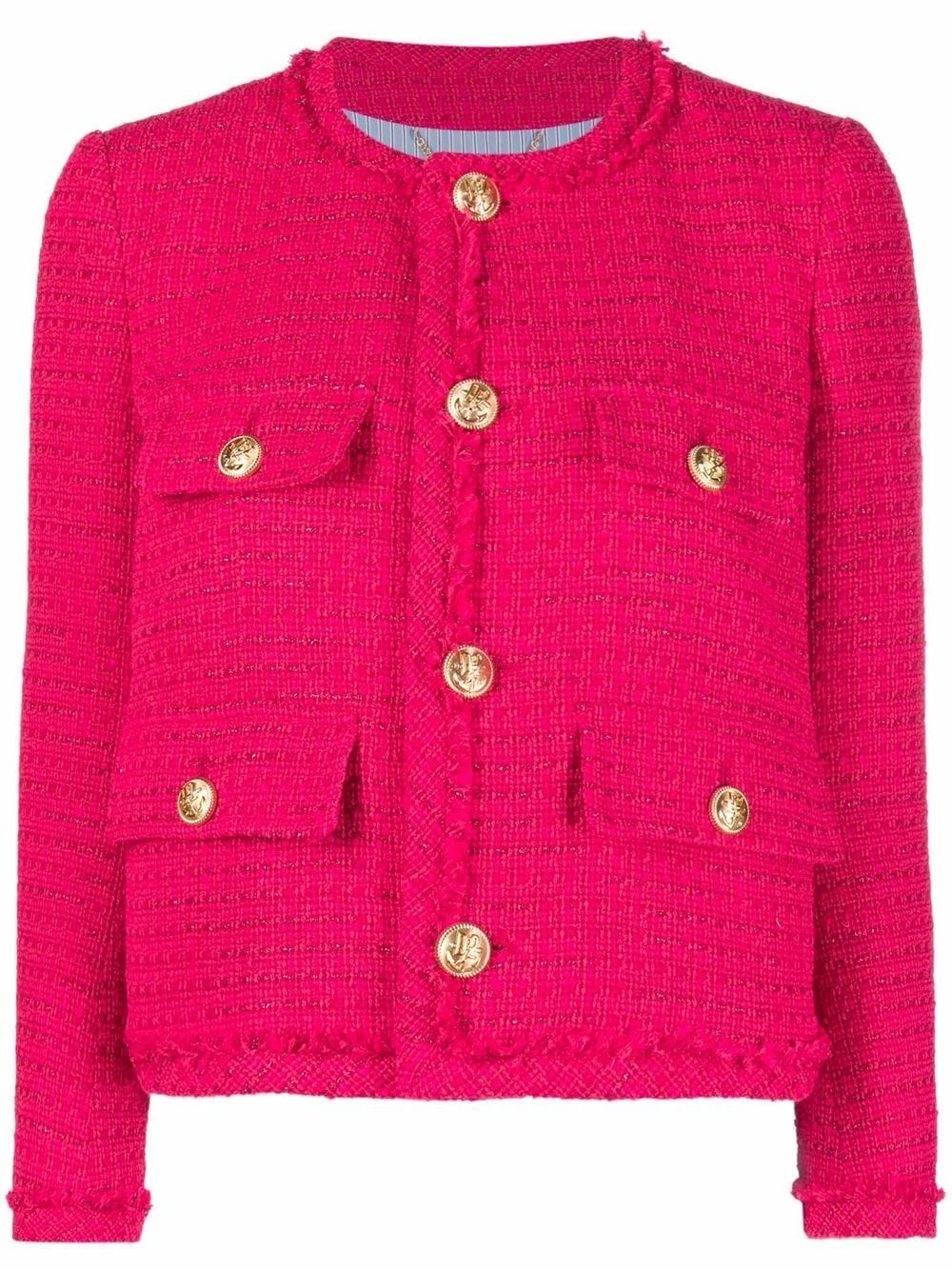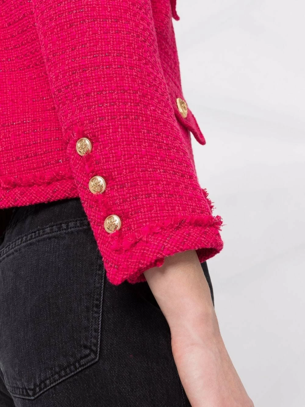 Encolure ronde, finitions en métal doré, poignets boutonnés, quatre poches plaquées devant. Couleur : rouge. Matière : Tweed.