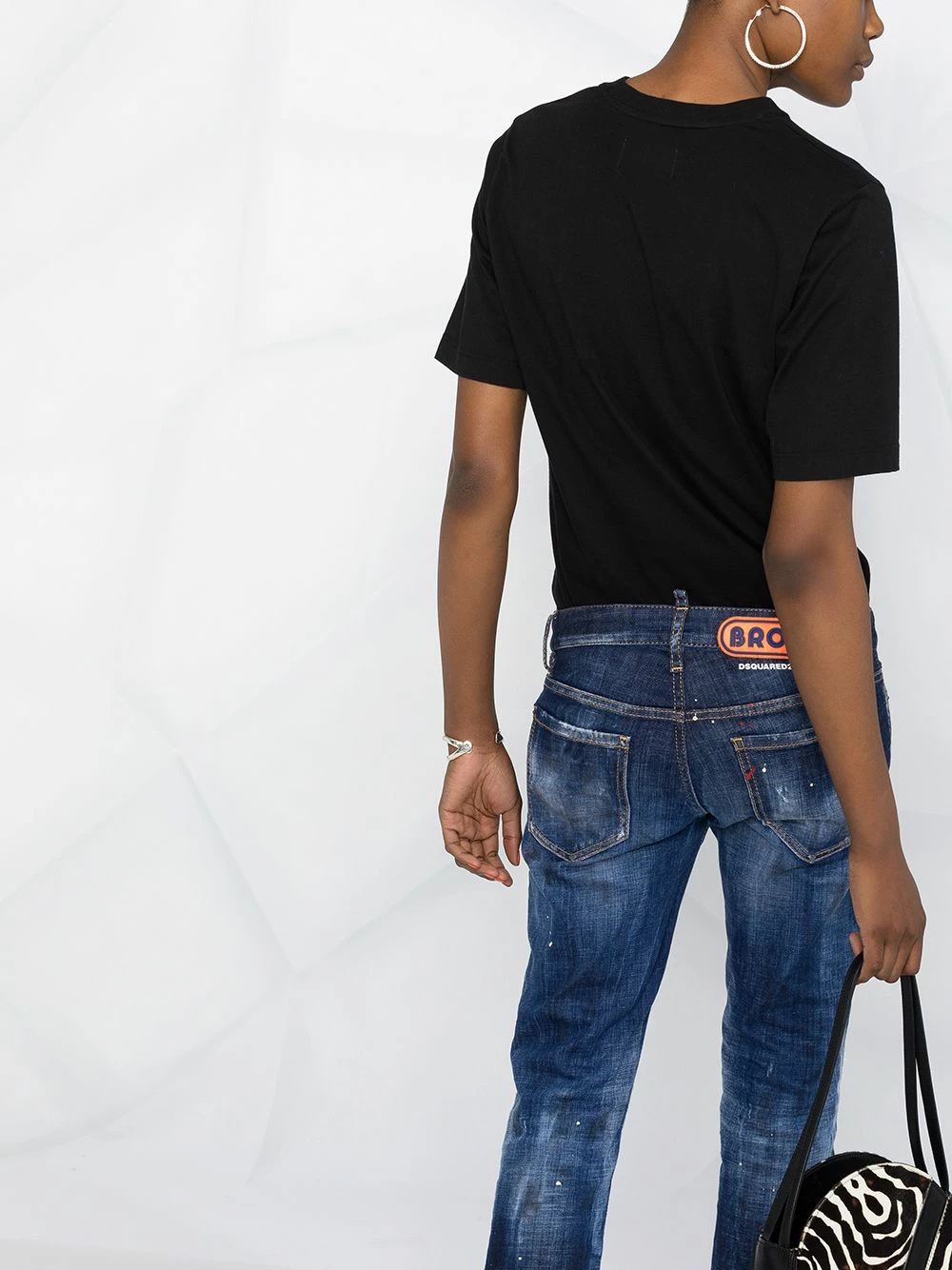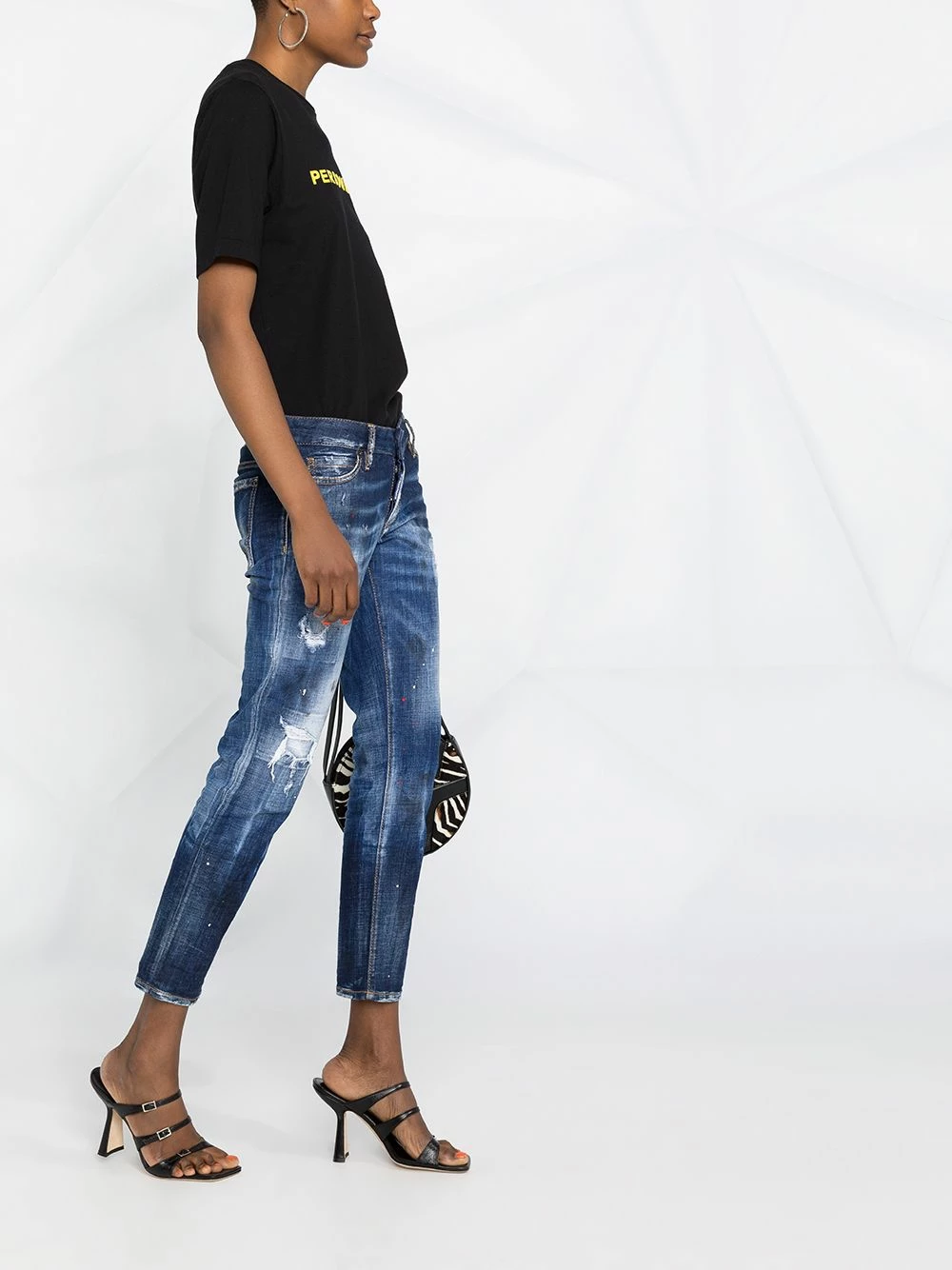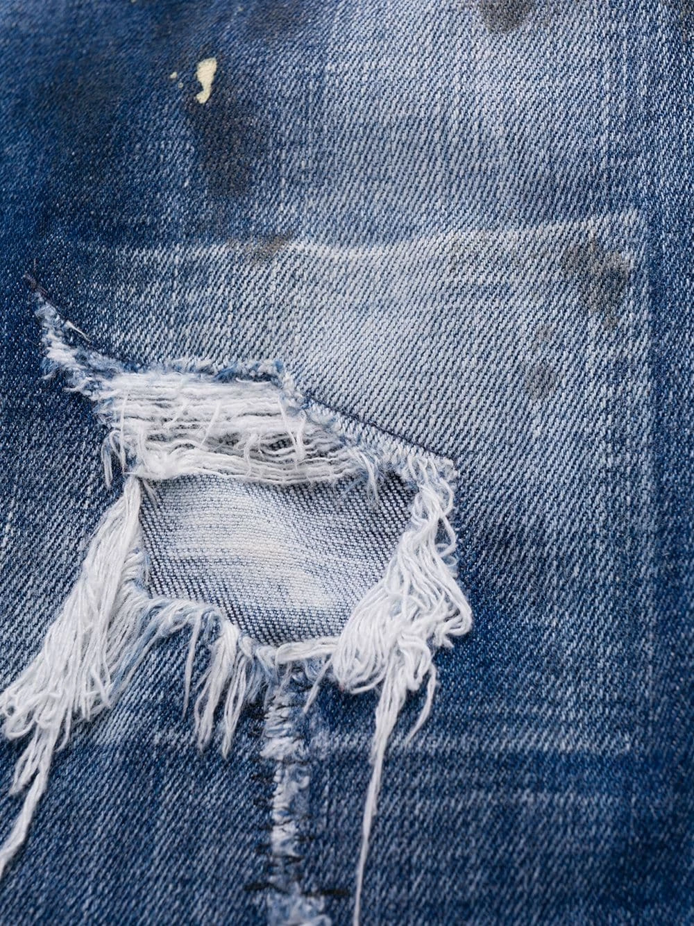 Effet usé, effet taches de peinture, finitions effilochées, coupe droite, coupe courte, fermeture à zip et boutons sur le devant, 5 poches classiques. Couleur : bleu.