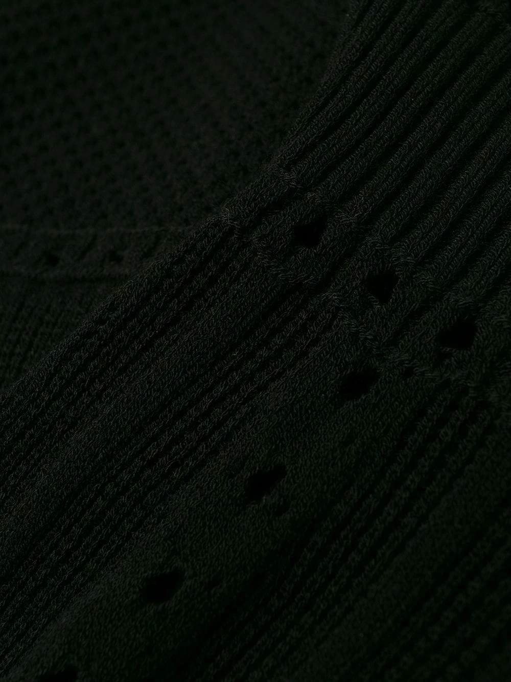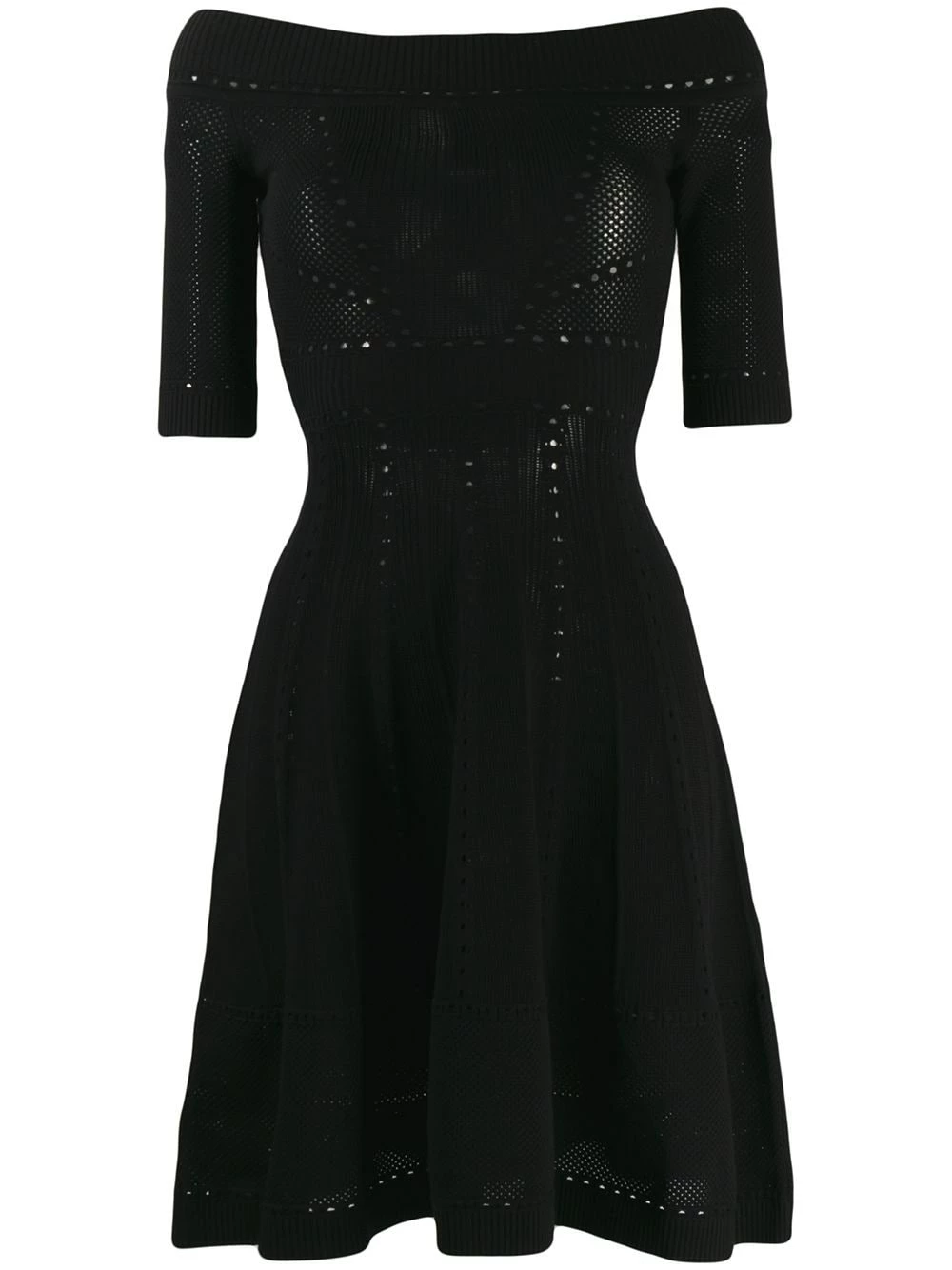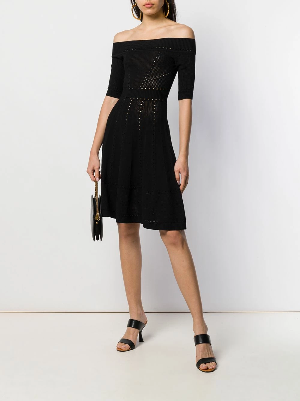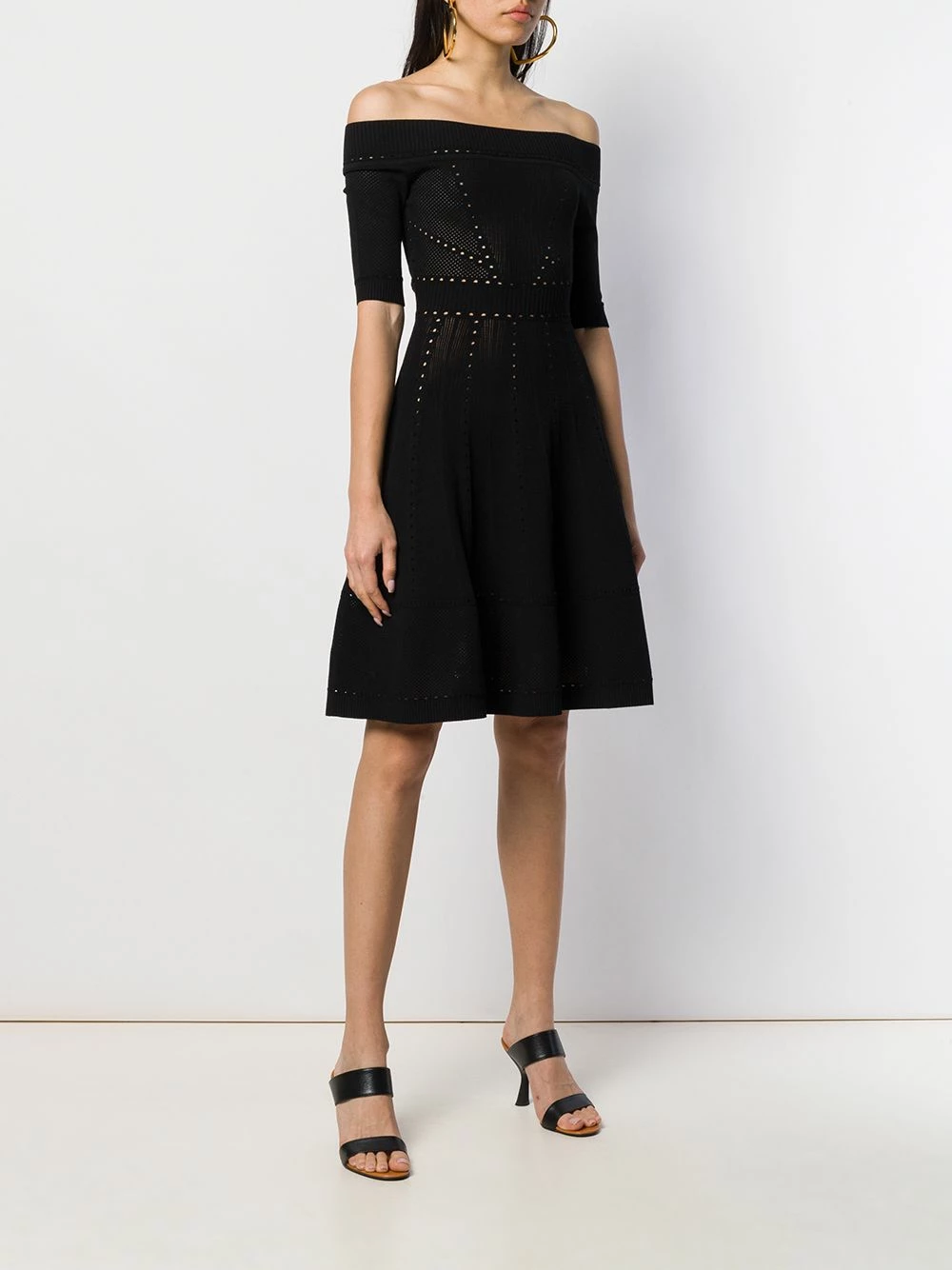 Robe courte en maille à épaules dénudées Dsquared2 avec bordure nervurée, détails perforés, coupe évasée, longueur courte et manches courtes.
