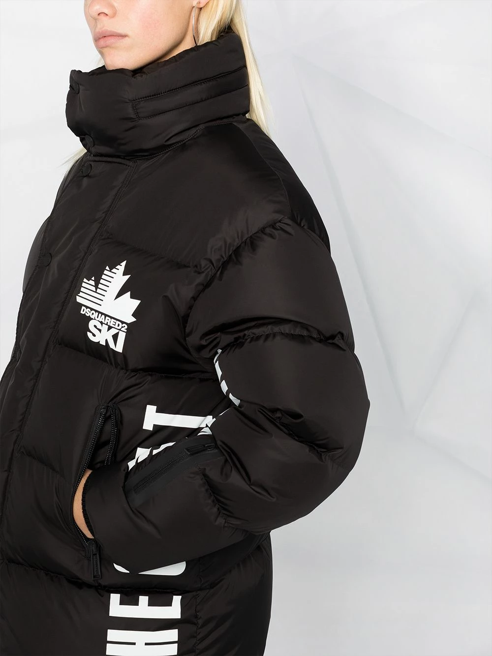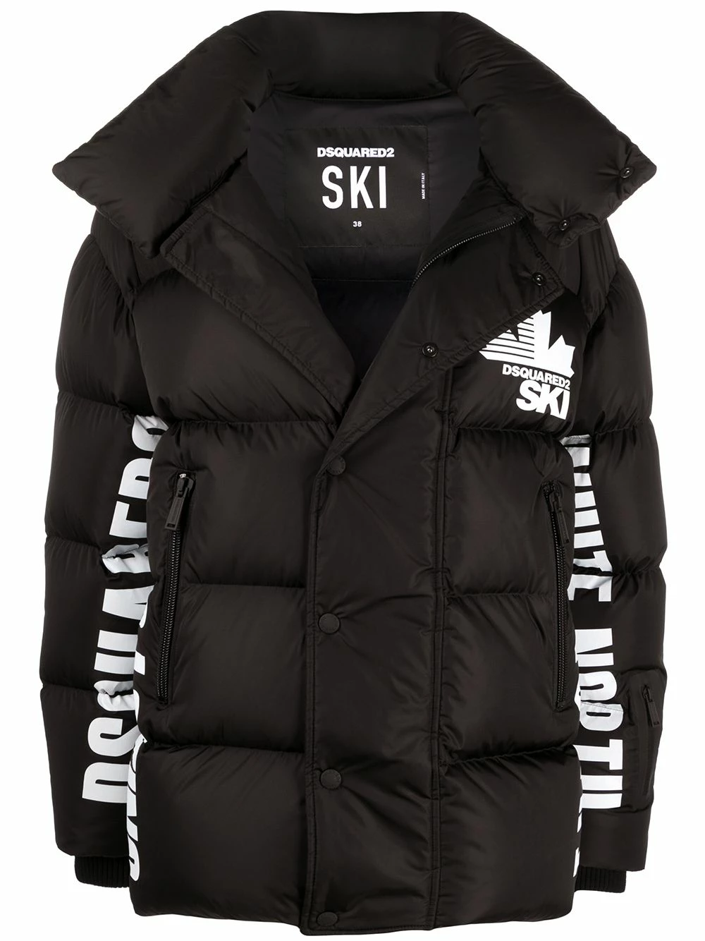 Design matelassé, logo imprimé à la poitrine, taille haute, fermeture à bouton pression, deux poches zippées, manches longues, ourlet droit. Couleur : noir. Matière : coton.