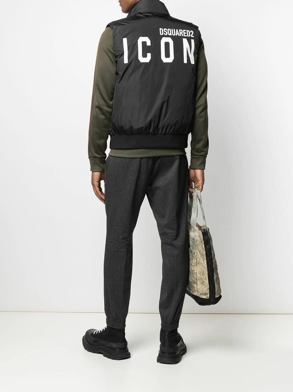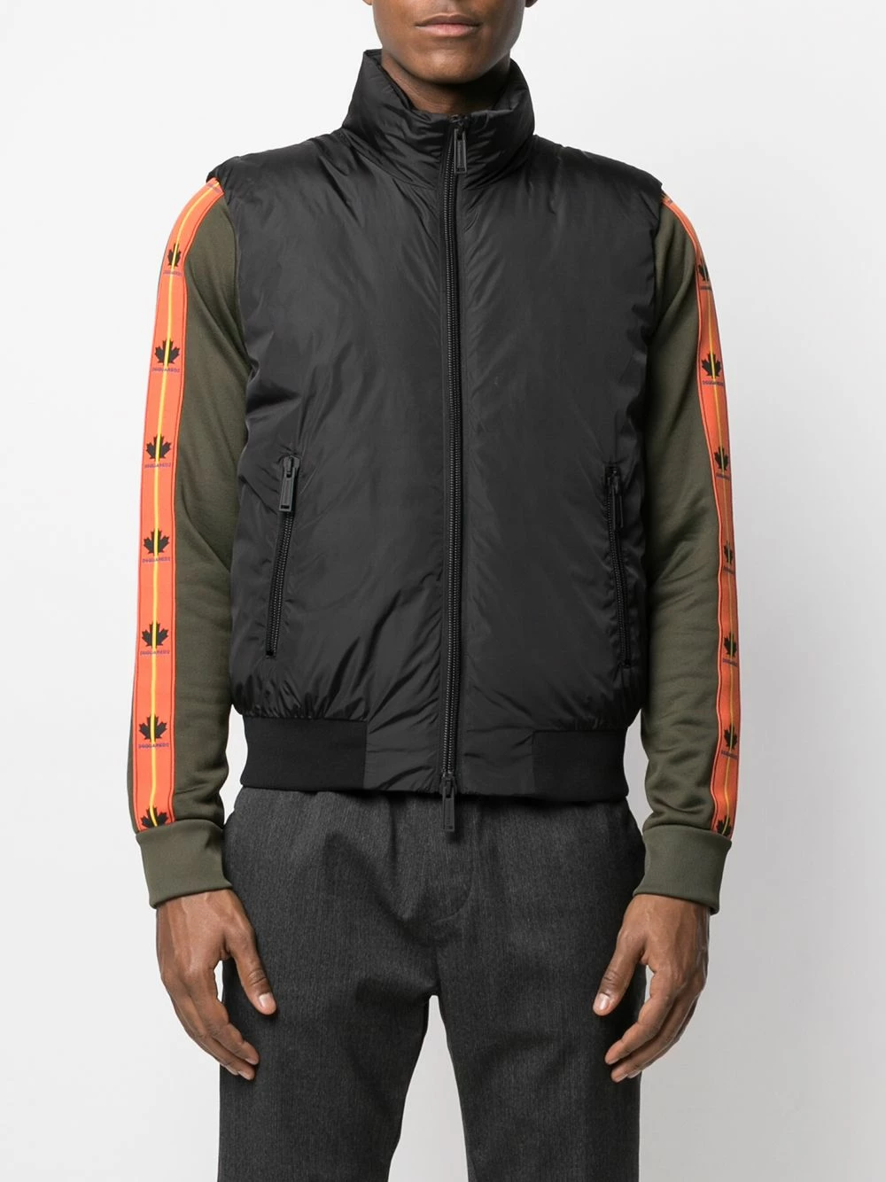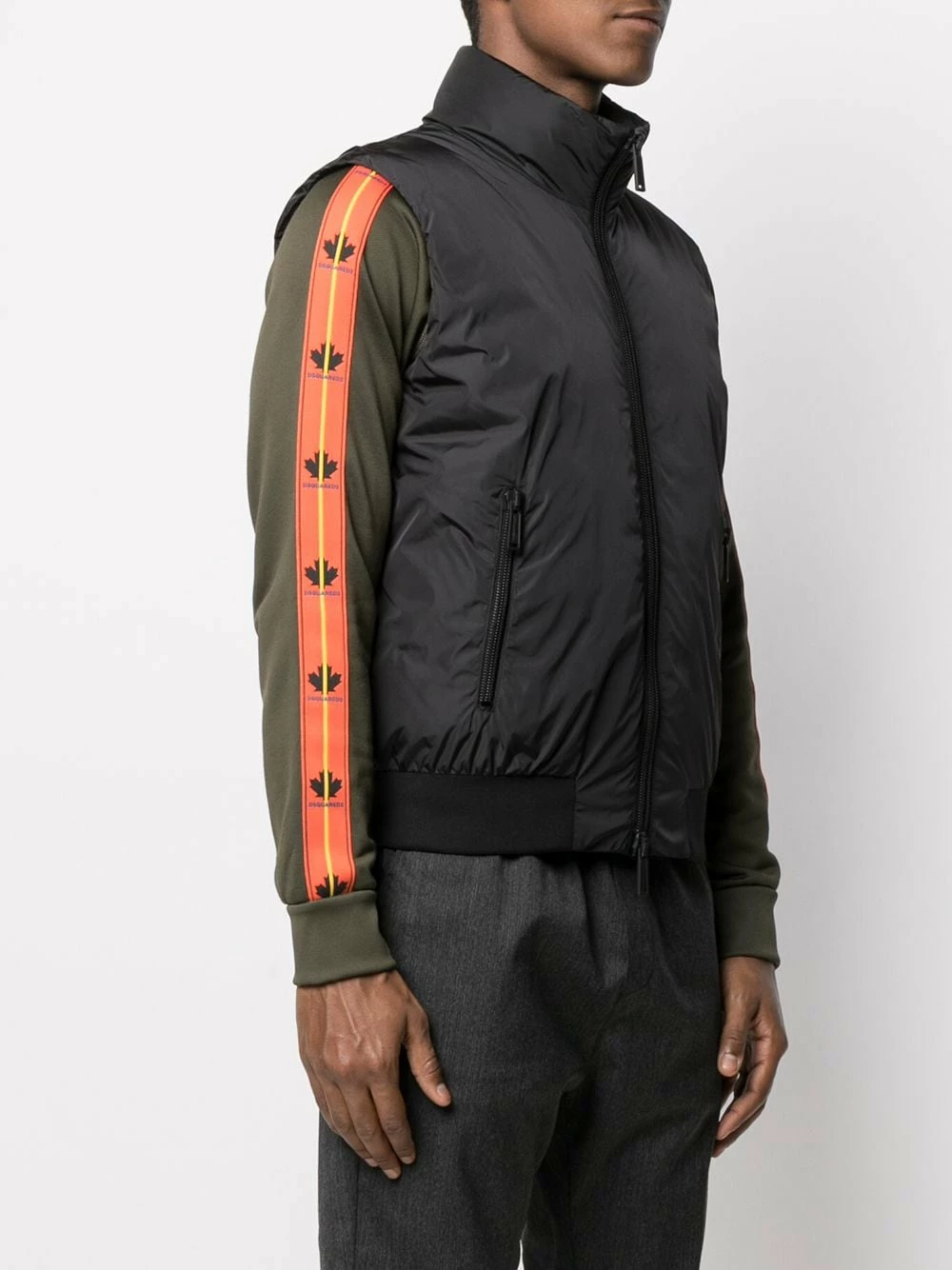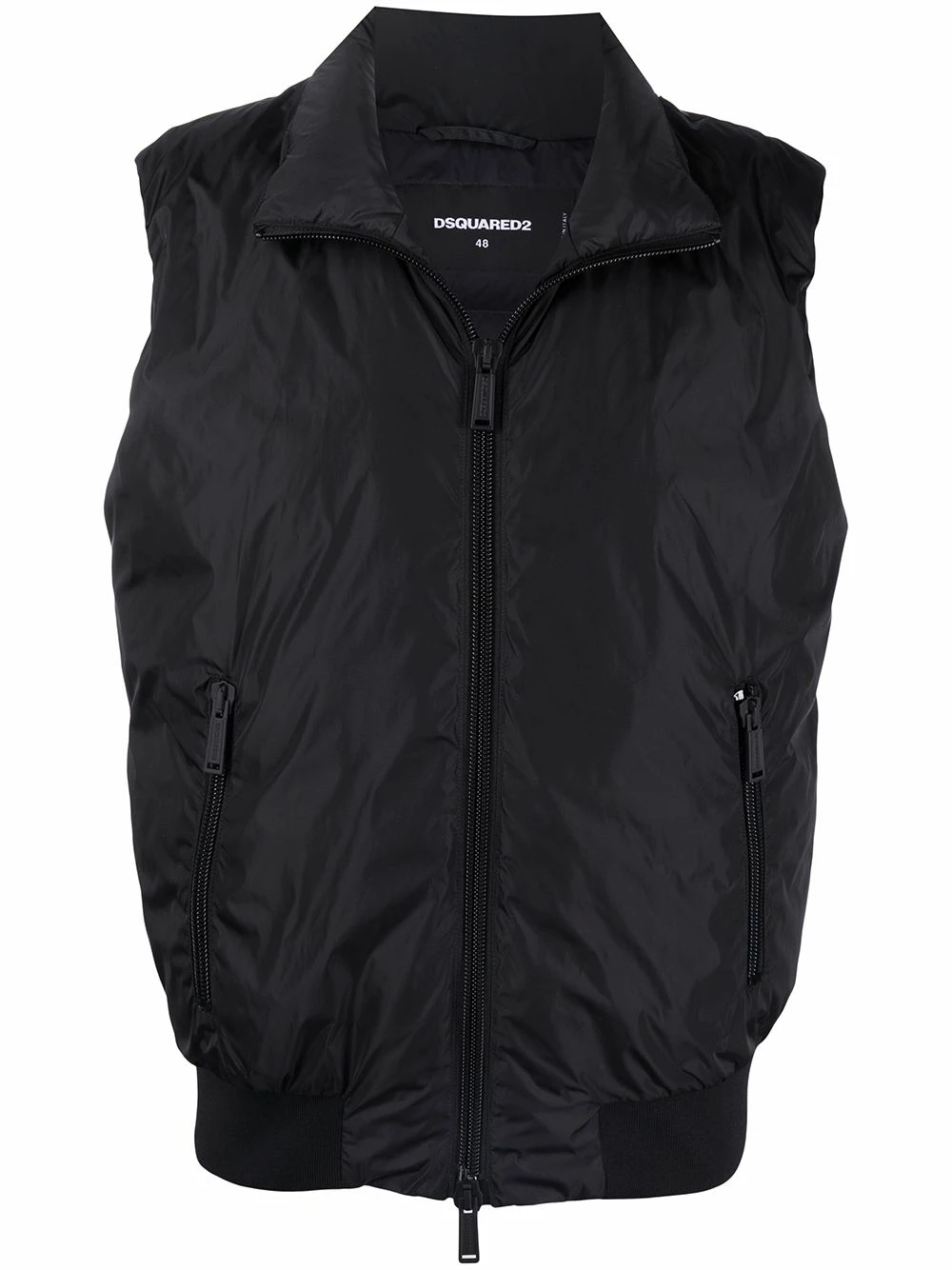 Design matelassé, logo imprimé à l’arrière, col montant, fermeture zippée devant, design sans manches, deux poches latérales zippées, ourlet droit. Couleur : Noir.