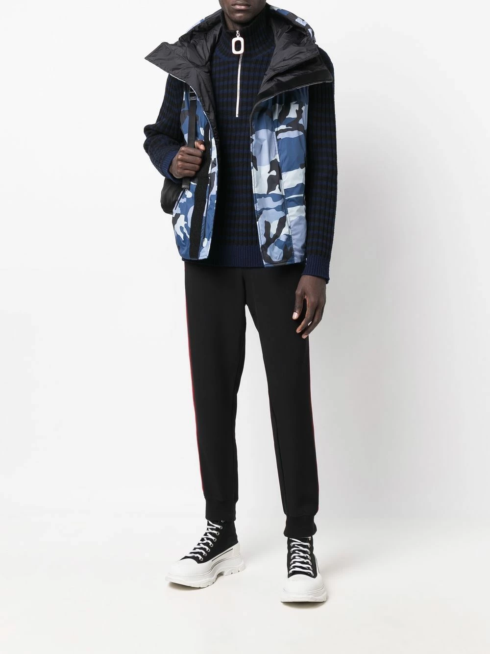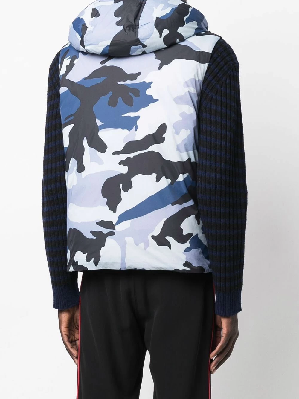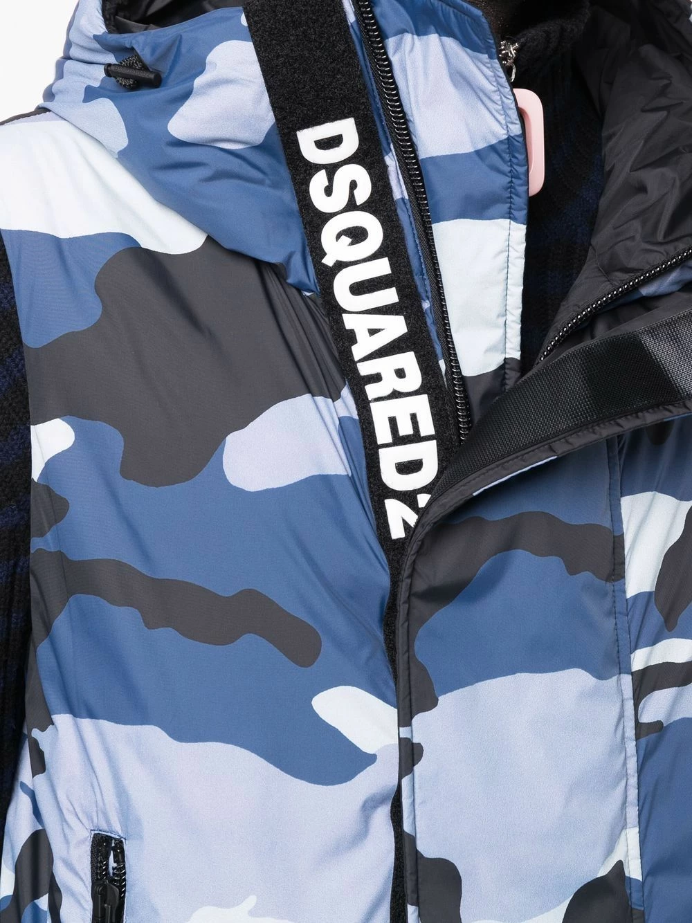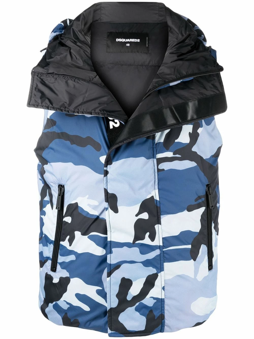 Motif camouflage, logo imprimé sur le devant, empiècements matelassés, garnissage en duvet, capuche classique, fermeture dissimulée sur le devant, poches à fermeture zippée devant, design sans manches, ourlet droit.