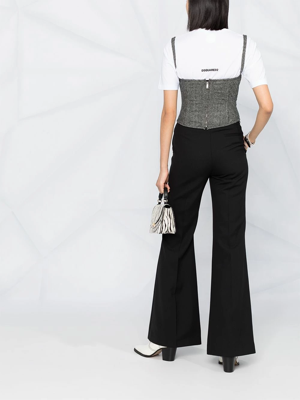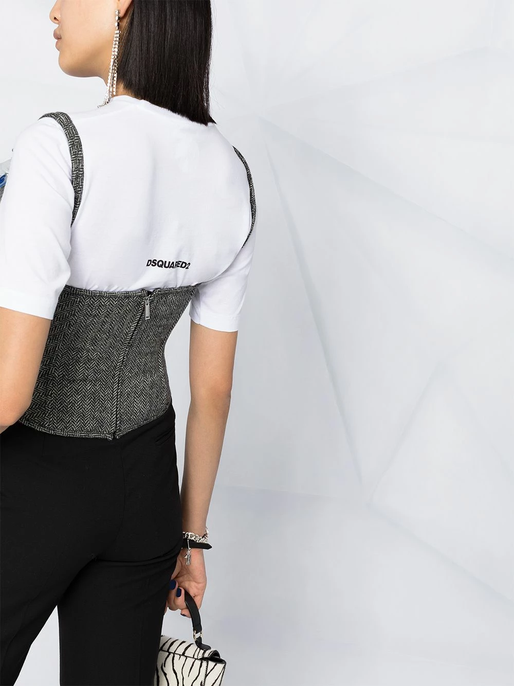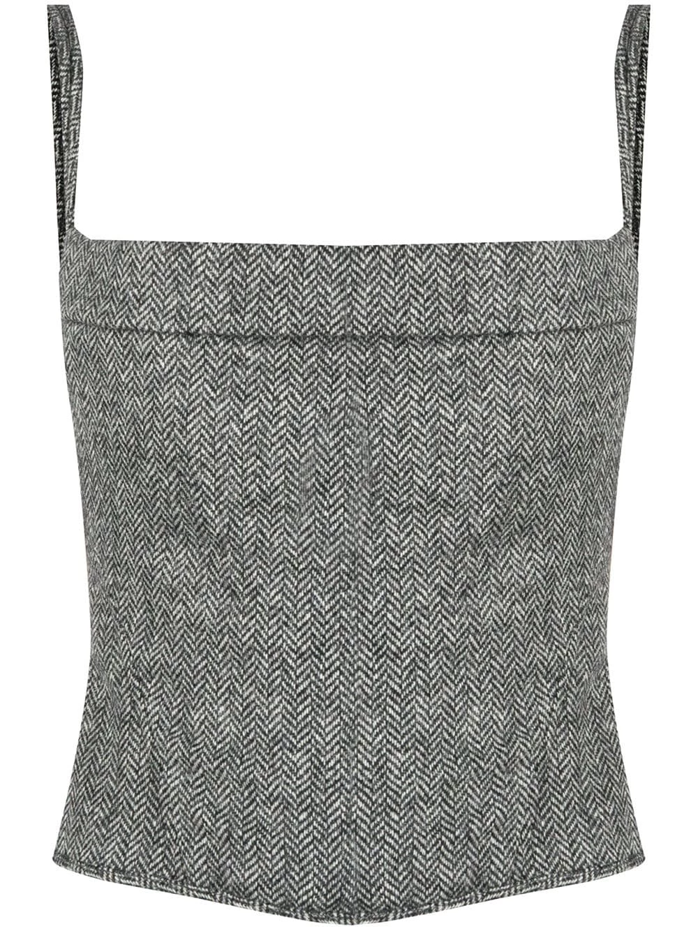 Silhouette ajustée, deux brides portées épaule ajustables, encolure carrée, fermeture zippée à l’arrière. Matière : laine.