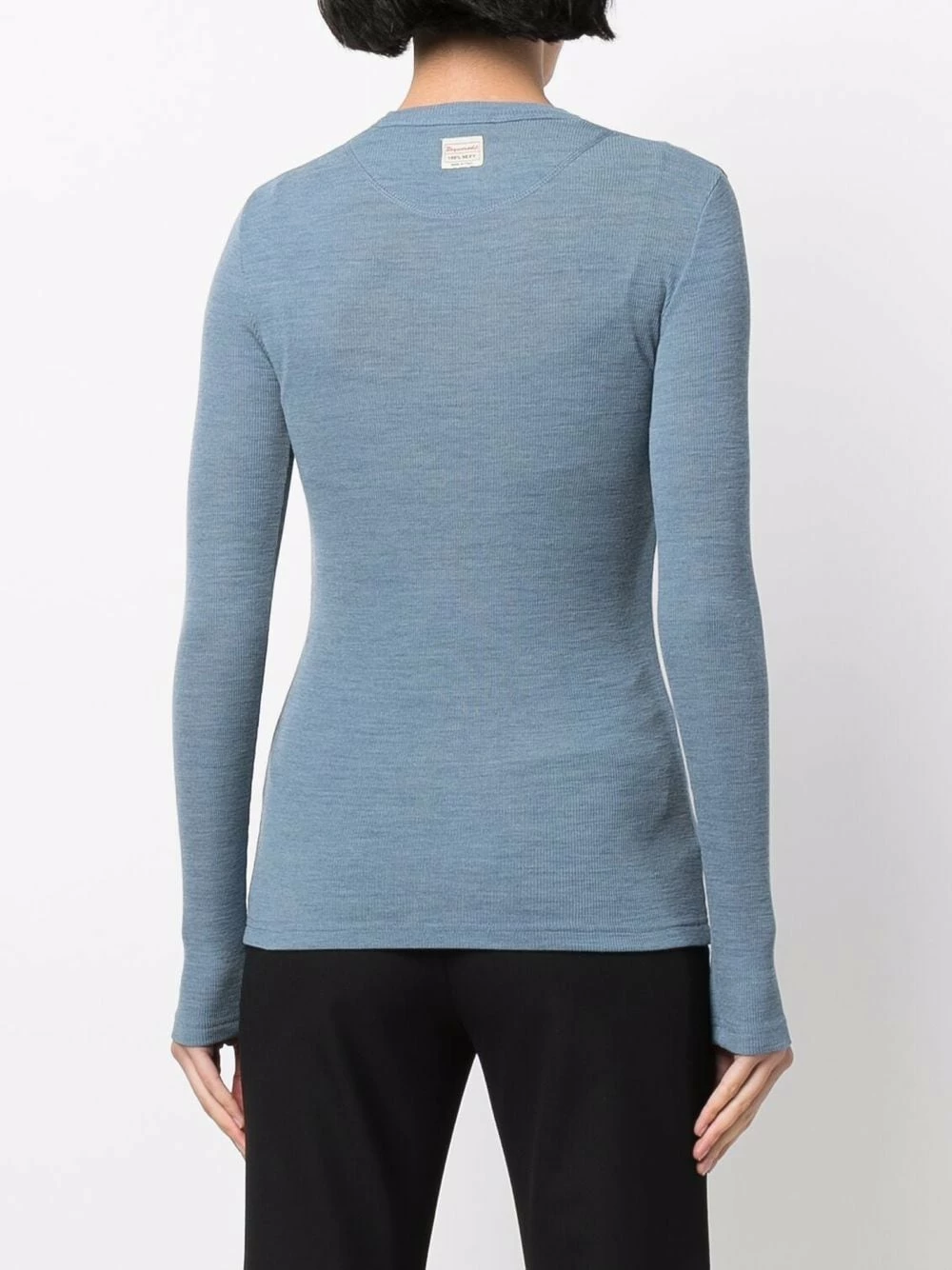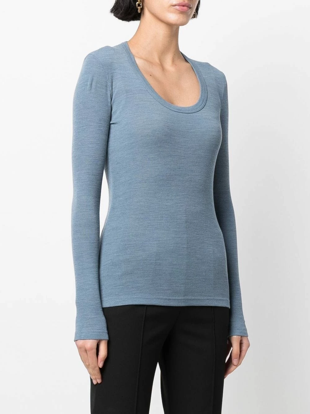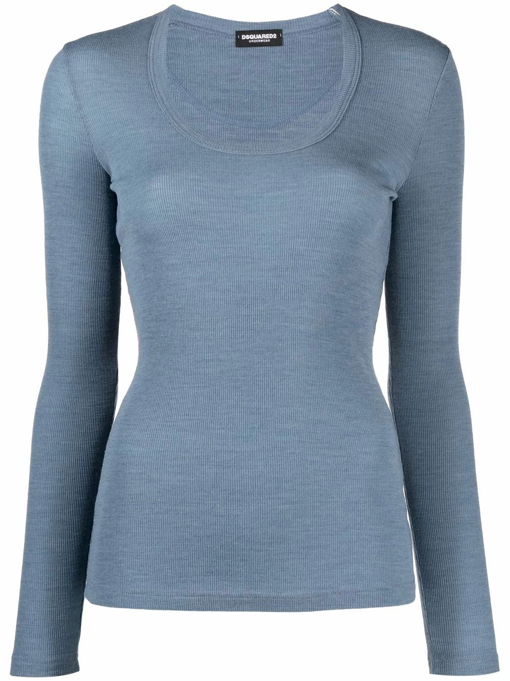 Bleu, laine mélangée, maille nervurée, encolure arrondie, manches longues, ourlet droit.