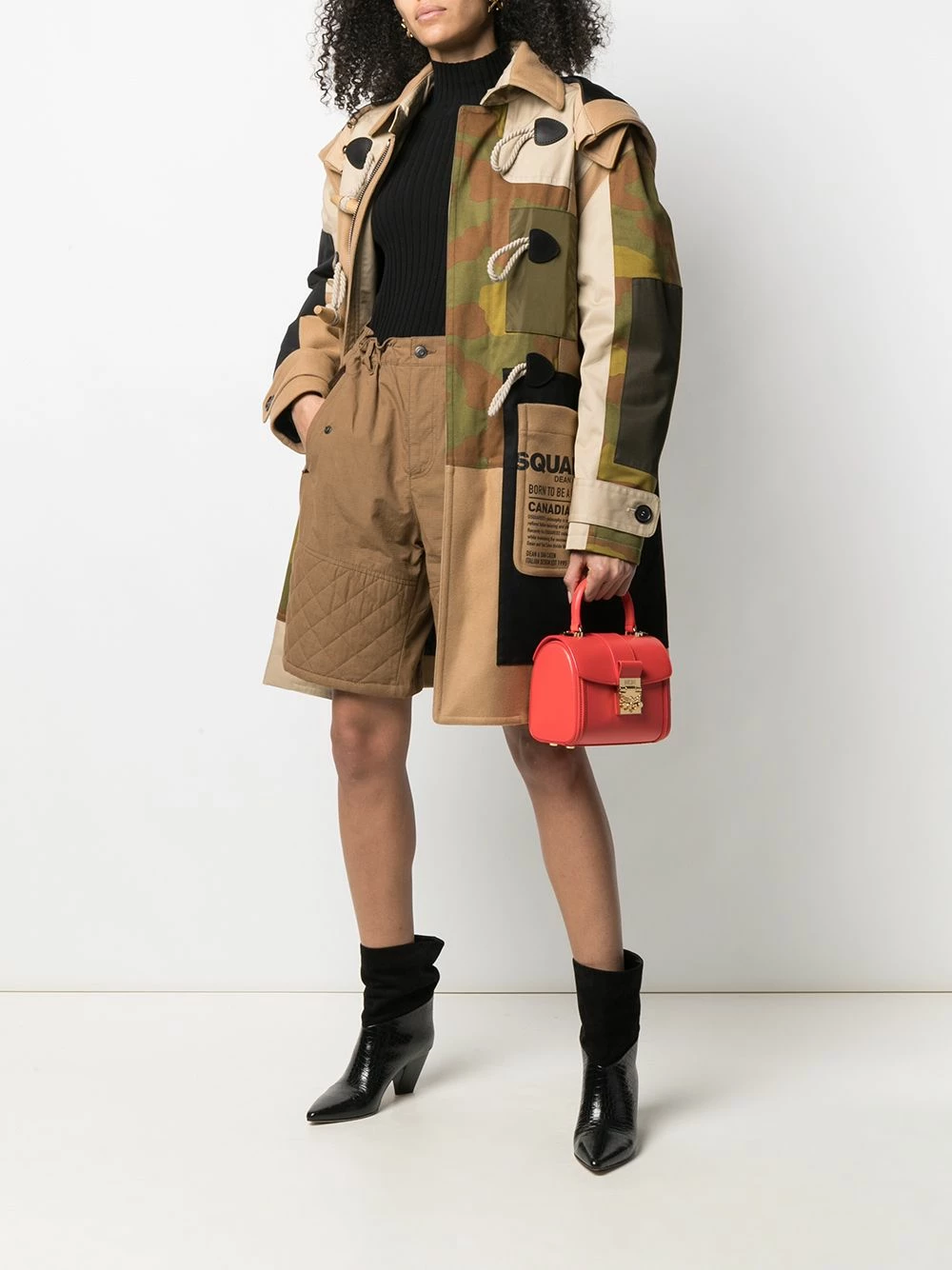 Taille haute, lien de resserrage, poches plaquées latérales, effet matelassé, hauteur genou. Matière : coton.