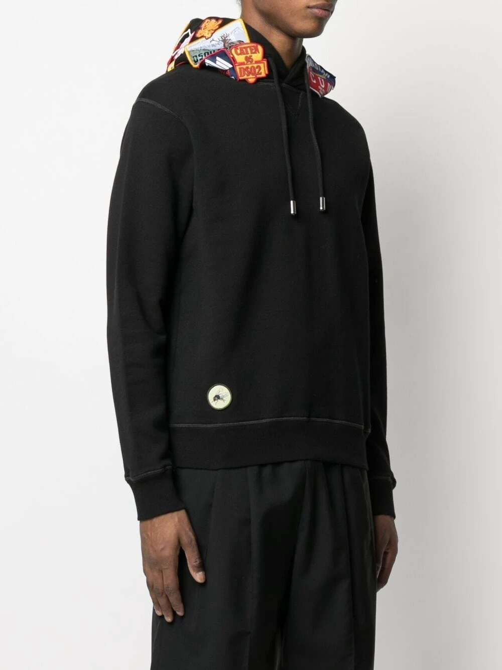 Détail de patch, capuche à lien de resserrage, manches longues, ourlet droit. Couleur : noir. Matière : coton.