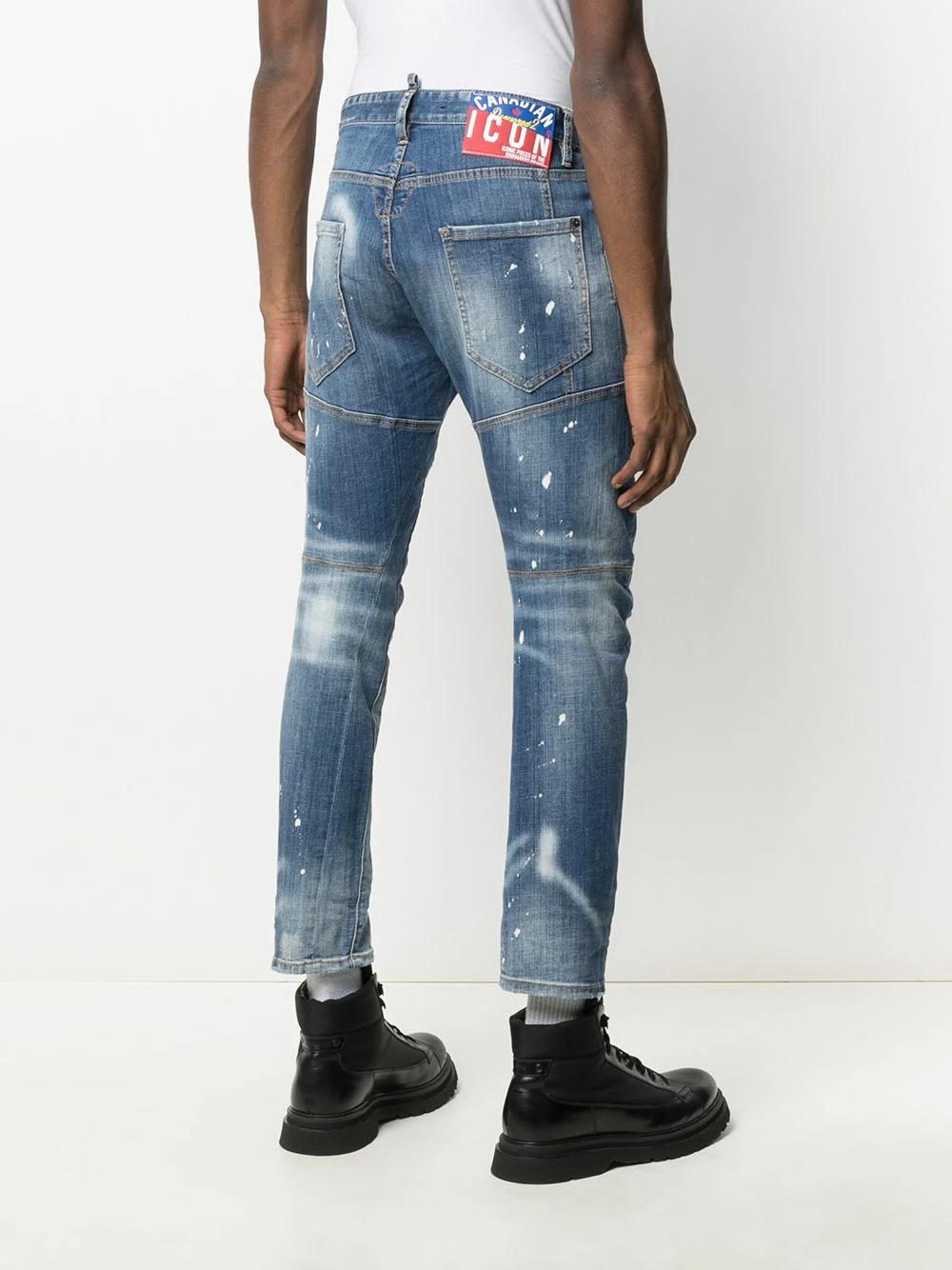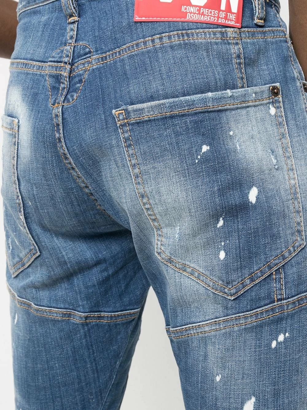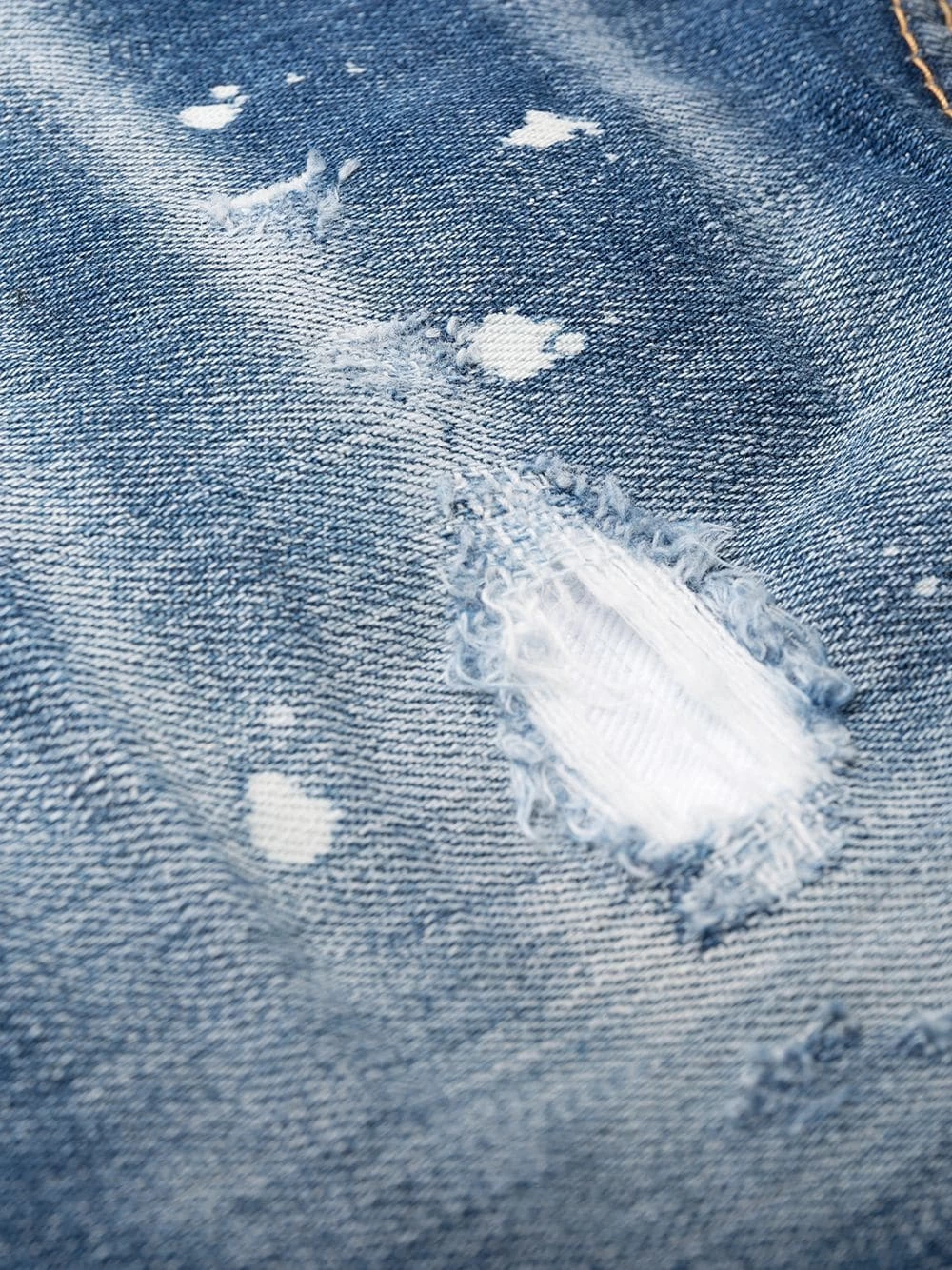 Effet taches de peinture, finitions effilochées, patch logo sur l’arrière, passants de ceinture, fermeture à zip et boutons sur le devant, 5 poches classiques, coupe stretch. Couleur : bleu. Matière : coton mélangé.