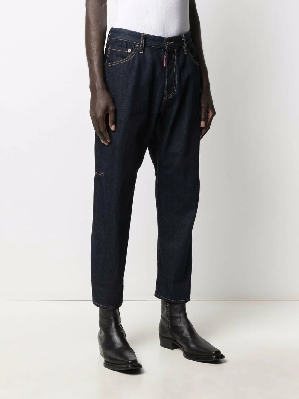 Coutures contrastantes, coupe droite, longueur crop, passants de ceinture, fermeture dissimulée sur le devant, cinq poches classiques.