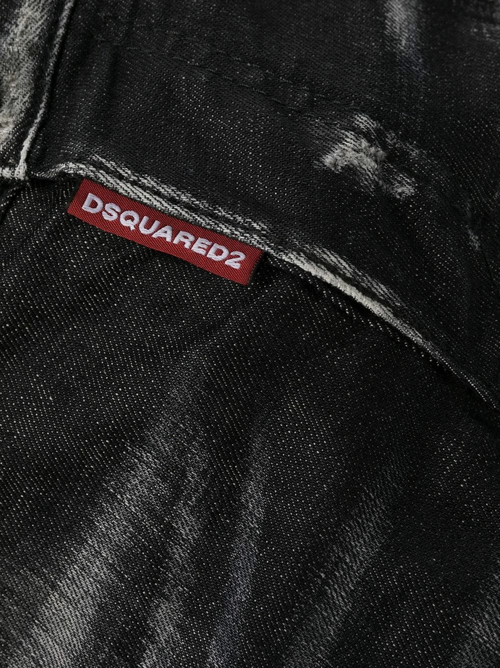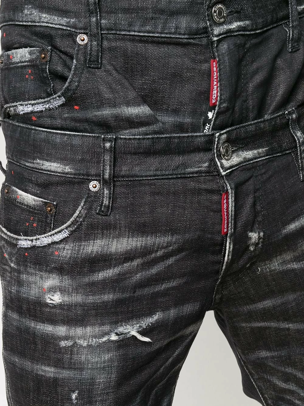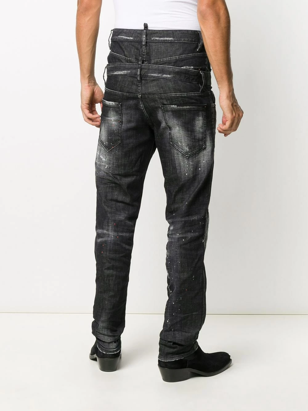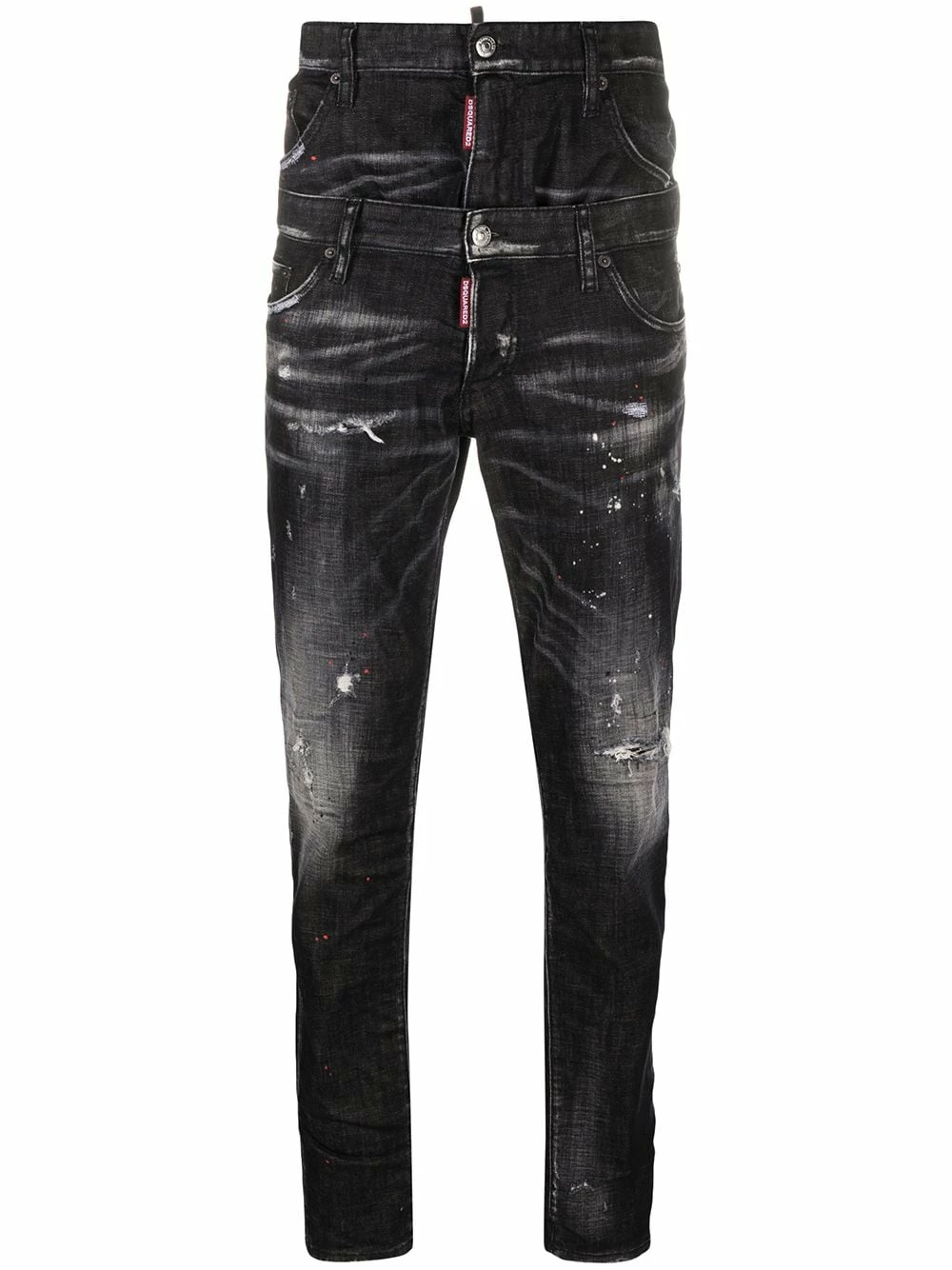 Finitions à effet usé, effet superposé, boutonnière sur le devant, passants de ceinture, 5 poches classiques, coupe droite. Couleur : noir.