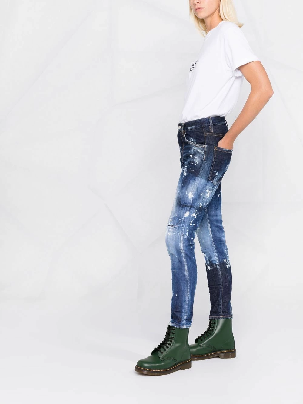 Effet usé, patch logo sur l’arrière, effet taches de peinture, passants de ceinture, fermeture à zip et boutons sur le devant, cinq poches classiques, construction stretch.