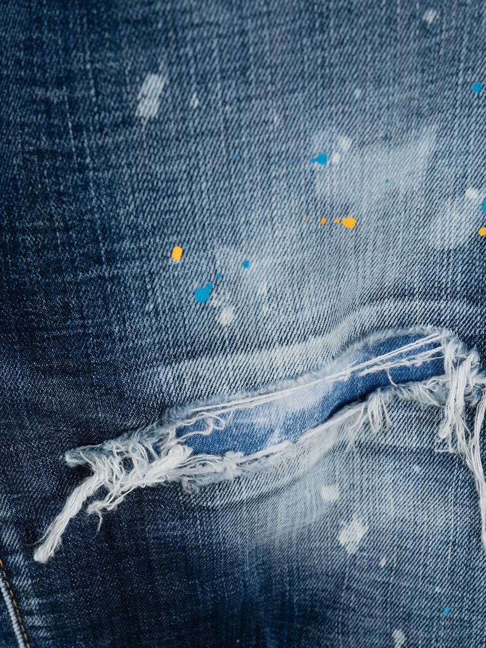Taille haute, fermeture à braguette dissimulée et bouton, effet usé. Couleur : Bleu.