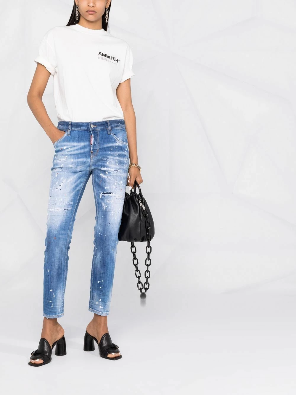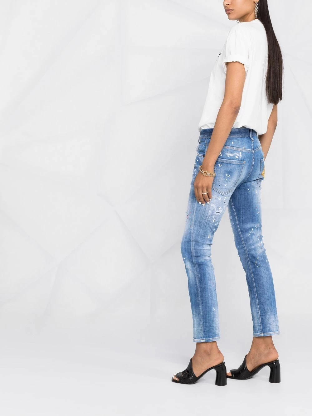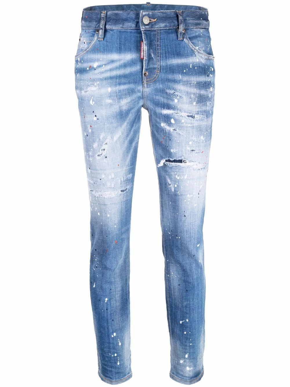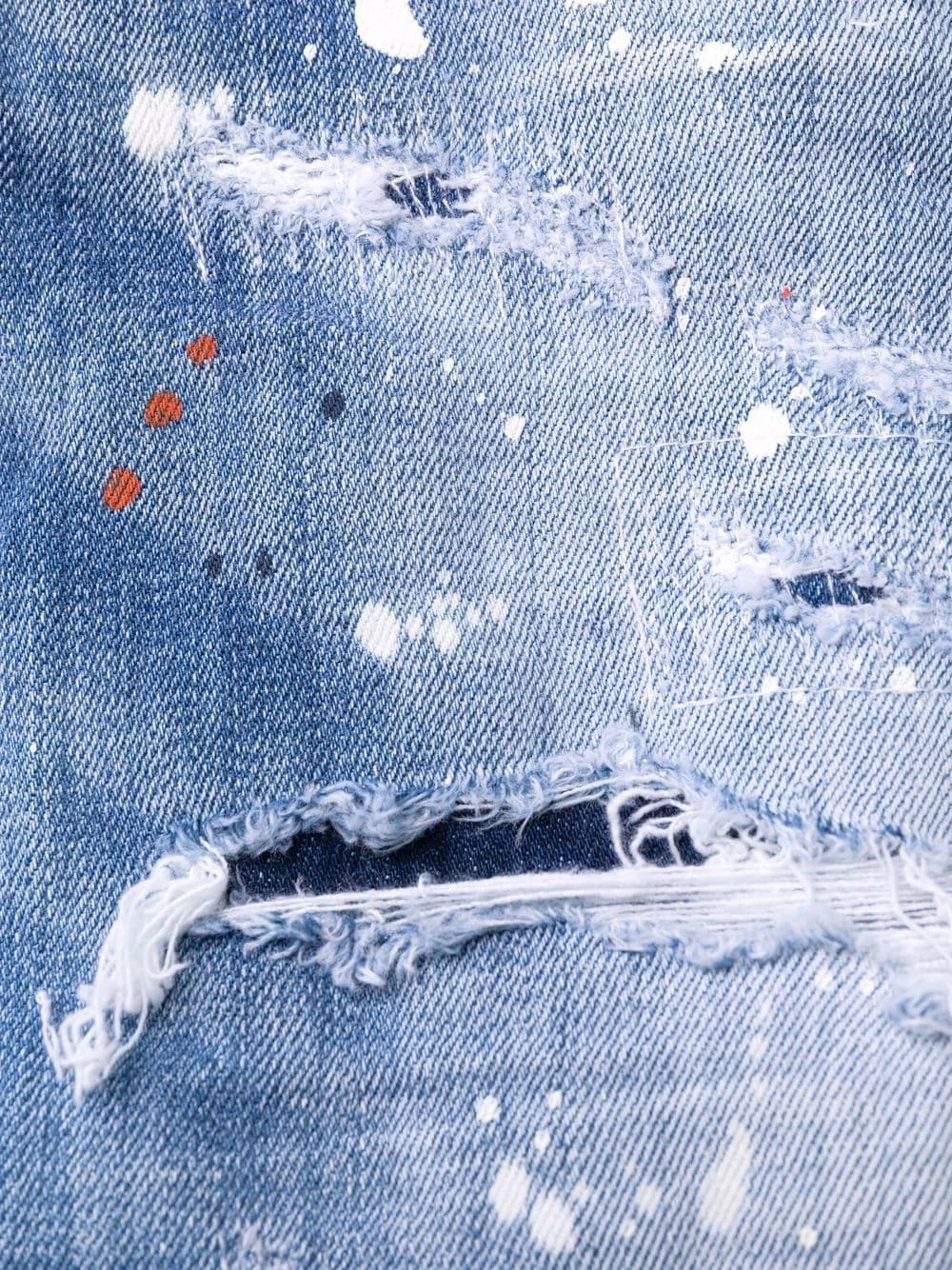 Taille mi-haute, passants de ceinture, fermeture boutonnée, cinq poches classiques, détails de clous couleur bronze, finitions effilochées, patch logo sur l’arrière. Couleur : bleu. Matière : coton mélangé.