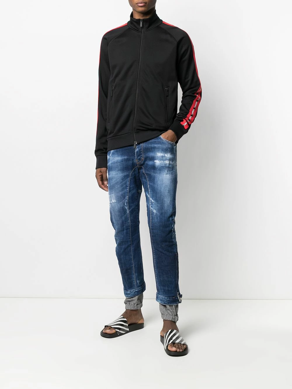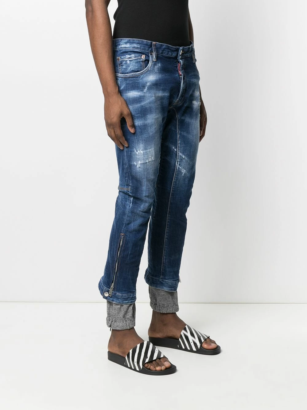 Design à empiècements, effet usé, détails zippés, ornements argentés, fermeture à zip et boutons sur le devant, passants de ceinture, poches latérales arrondies, poches arrière plaquées. Couleur : Bleu. Matière : coton.