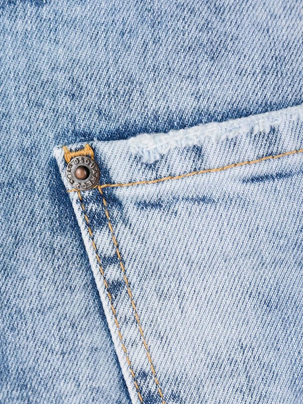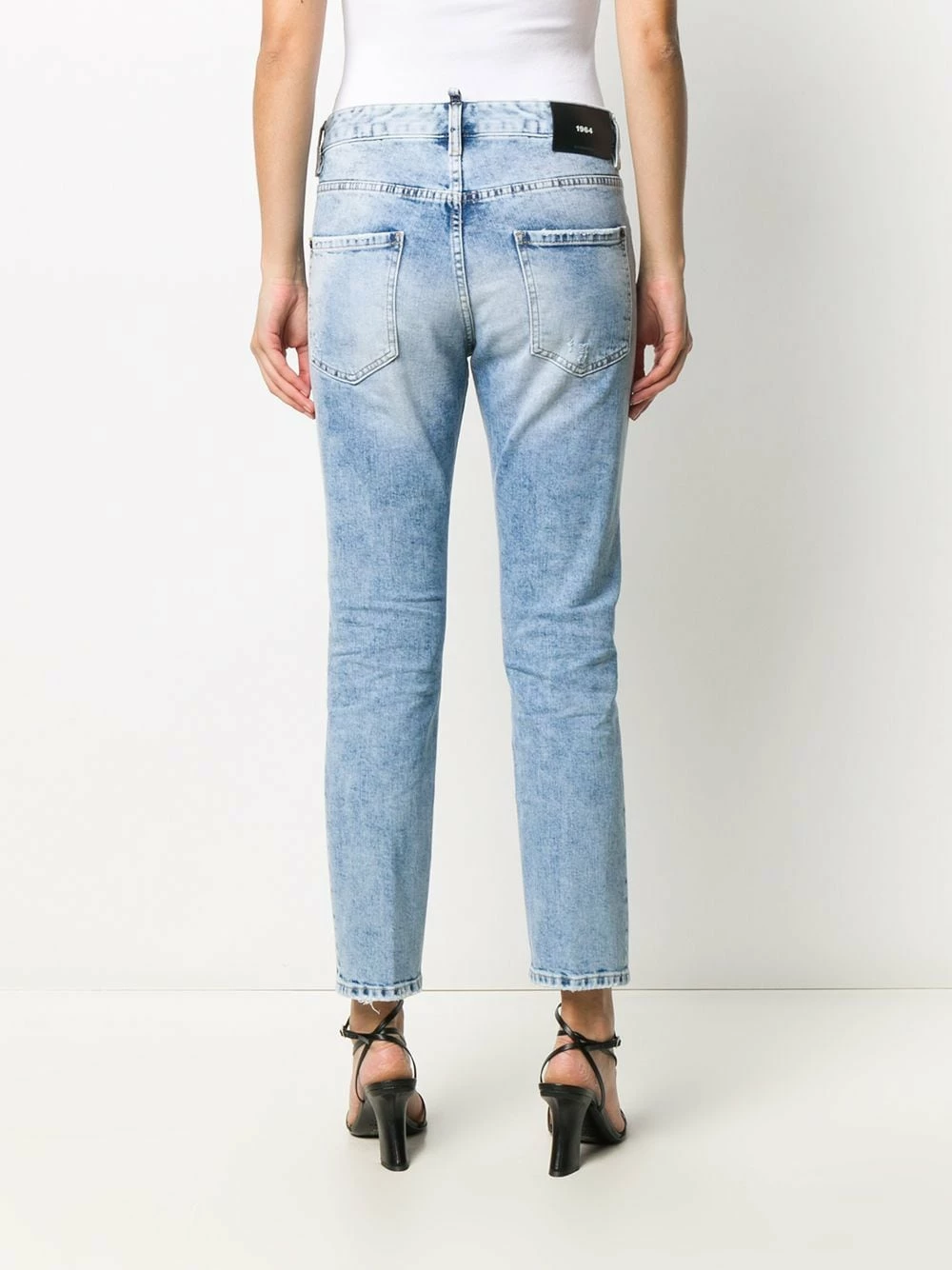Jean Cool Girl à effet usé en coton mélangé Dsquared2 avec bouton et zip, passants de ceinture, coupe classique cinq poches, effet délavé, effet usé et patch à logo à l’arrière. Couleur : bleu.