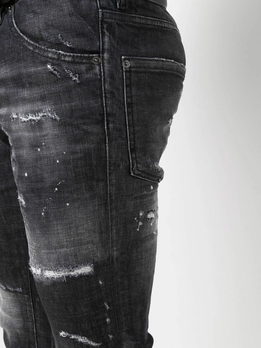 Construction stretch, finitions effilochées, patch logo sur l’arrière, effet taches de peinture, finitions à effet usé, fermeture boutonnée, passants de ceinture, cinq poches classiques.