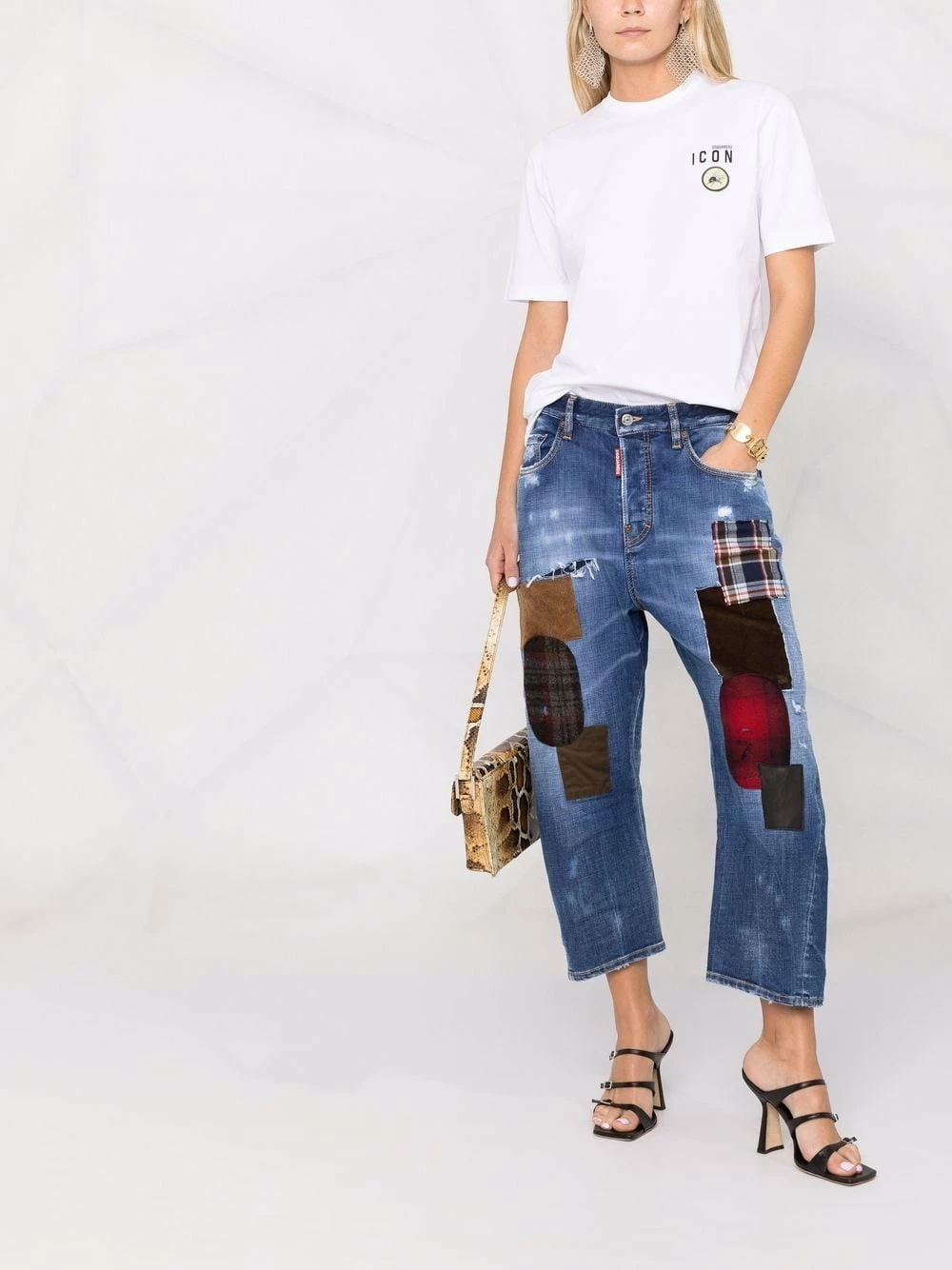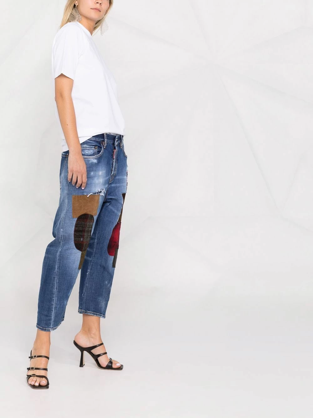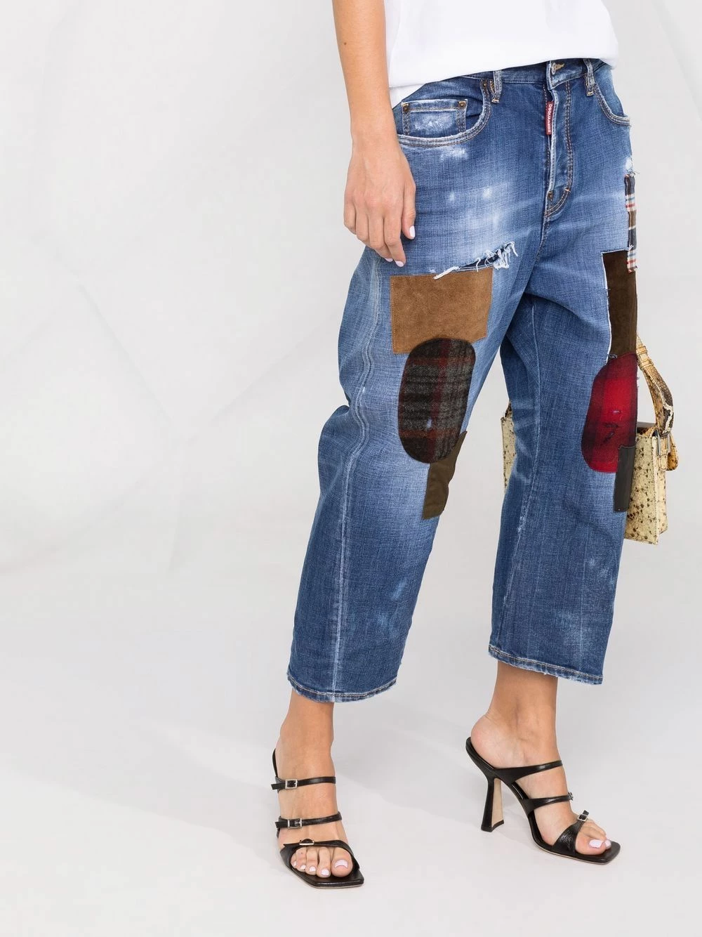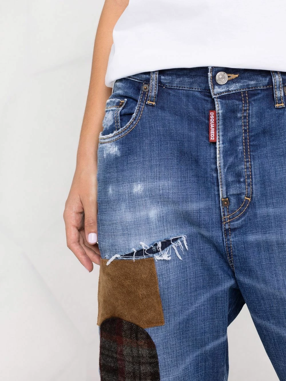 Design patchwork, finitions effilochées, taille basse, longueur crop, passants de ceinture, fermeture à zip et boutons sur le devant, cinq poches classiques. Couleur : bleu.