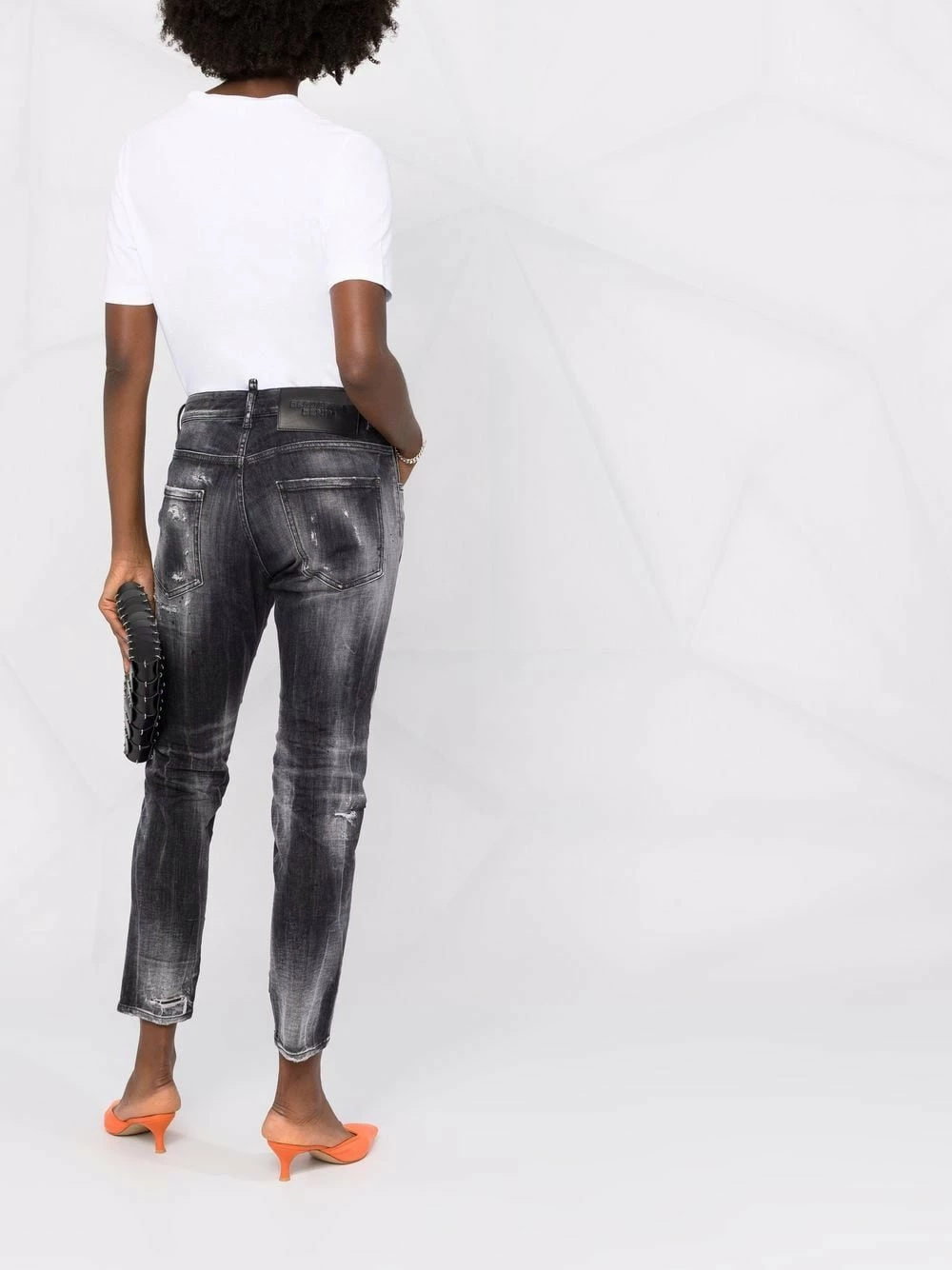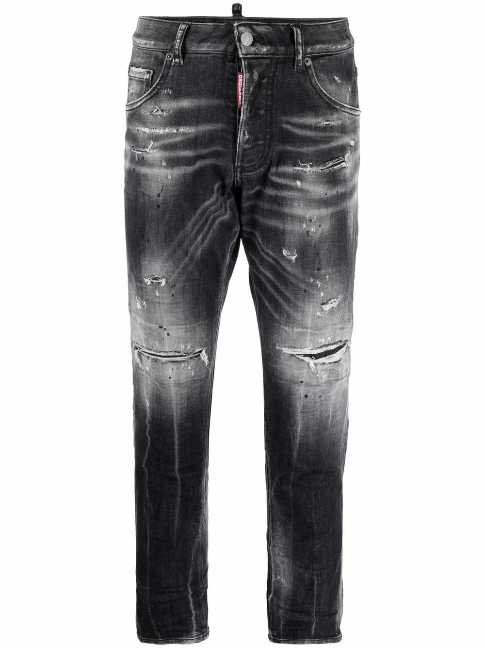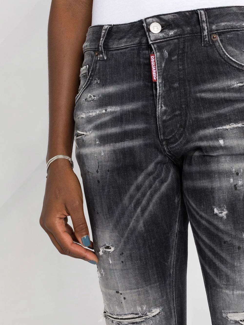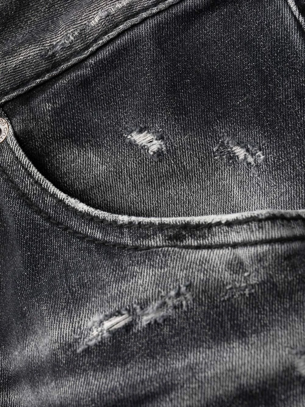 Effet taches de peinture, finitions effilochées, fermeture boutonnée, cinq poches classiques, coupe courte. Couleur : noir.