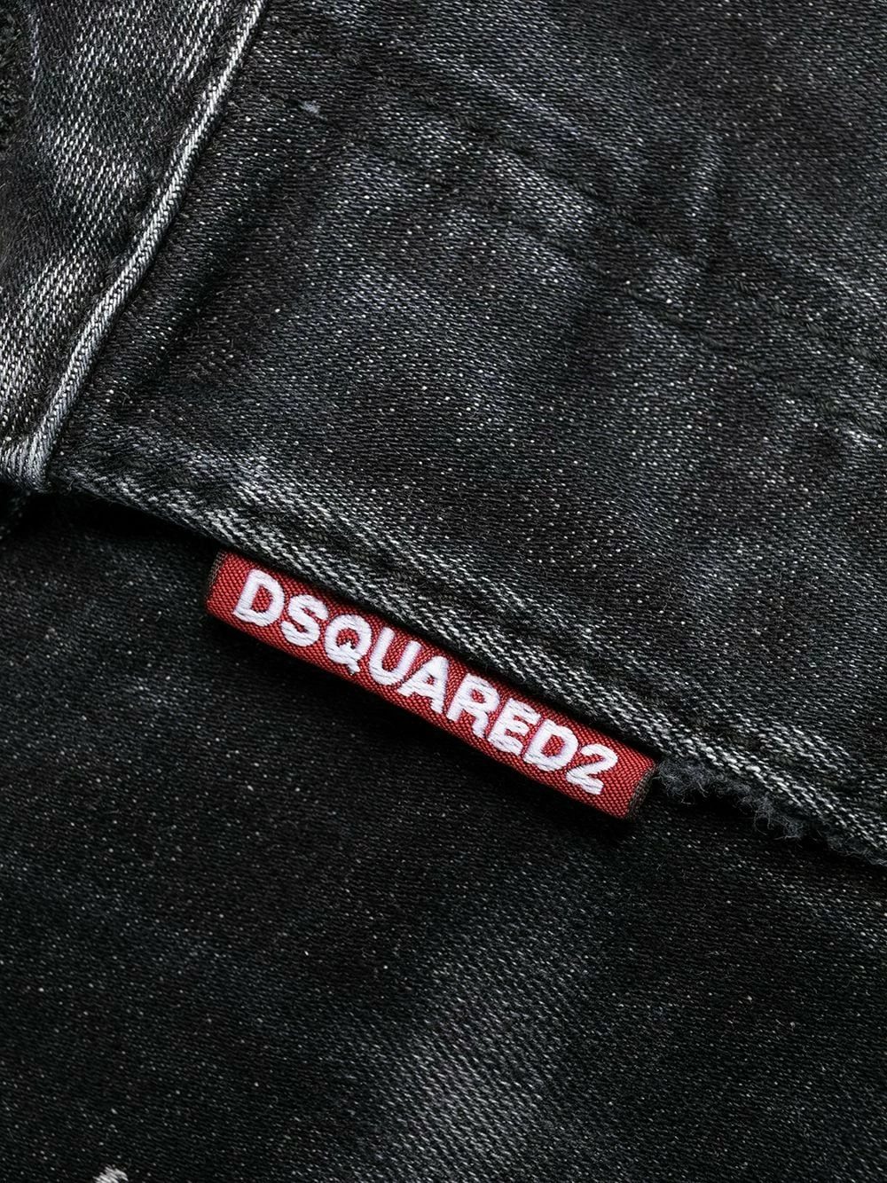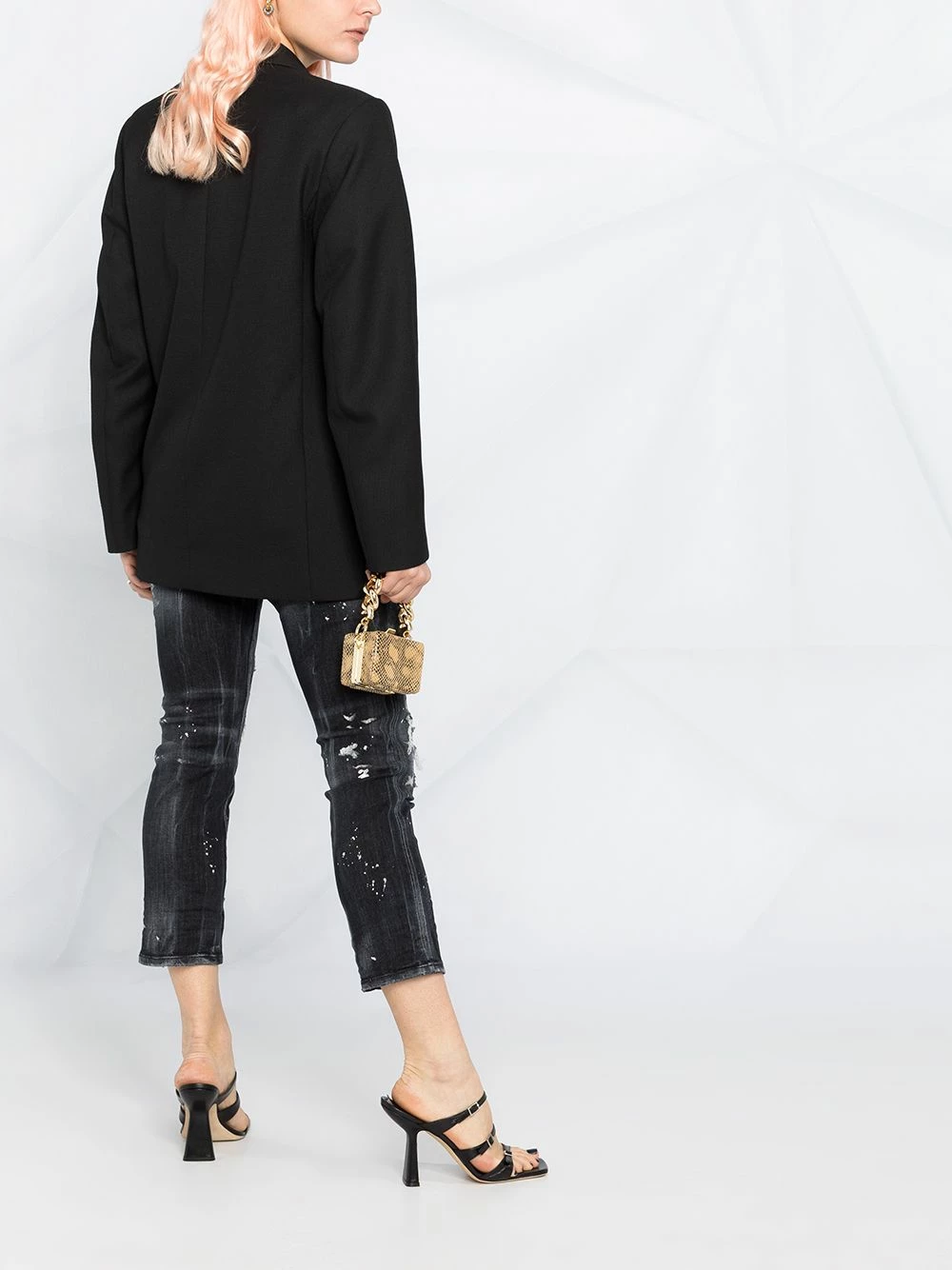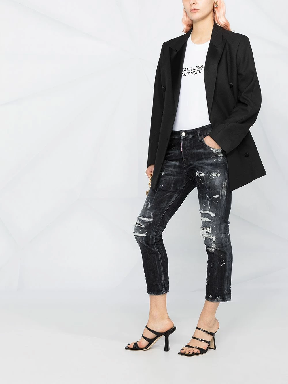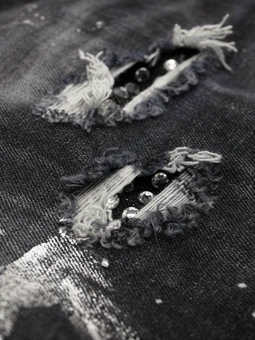 Ornement en cristal, finitions à effet usé sur les cuisses, effet usé, taille mi-haute, longueur crop, passants de ceinture, fermeture dissimulée sur le devant, 5 poches classiques. Couleur : noir.