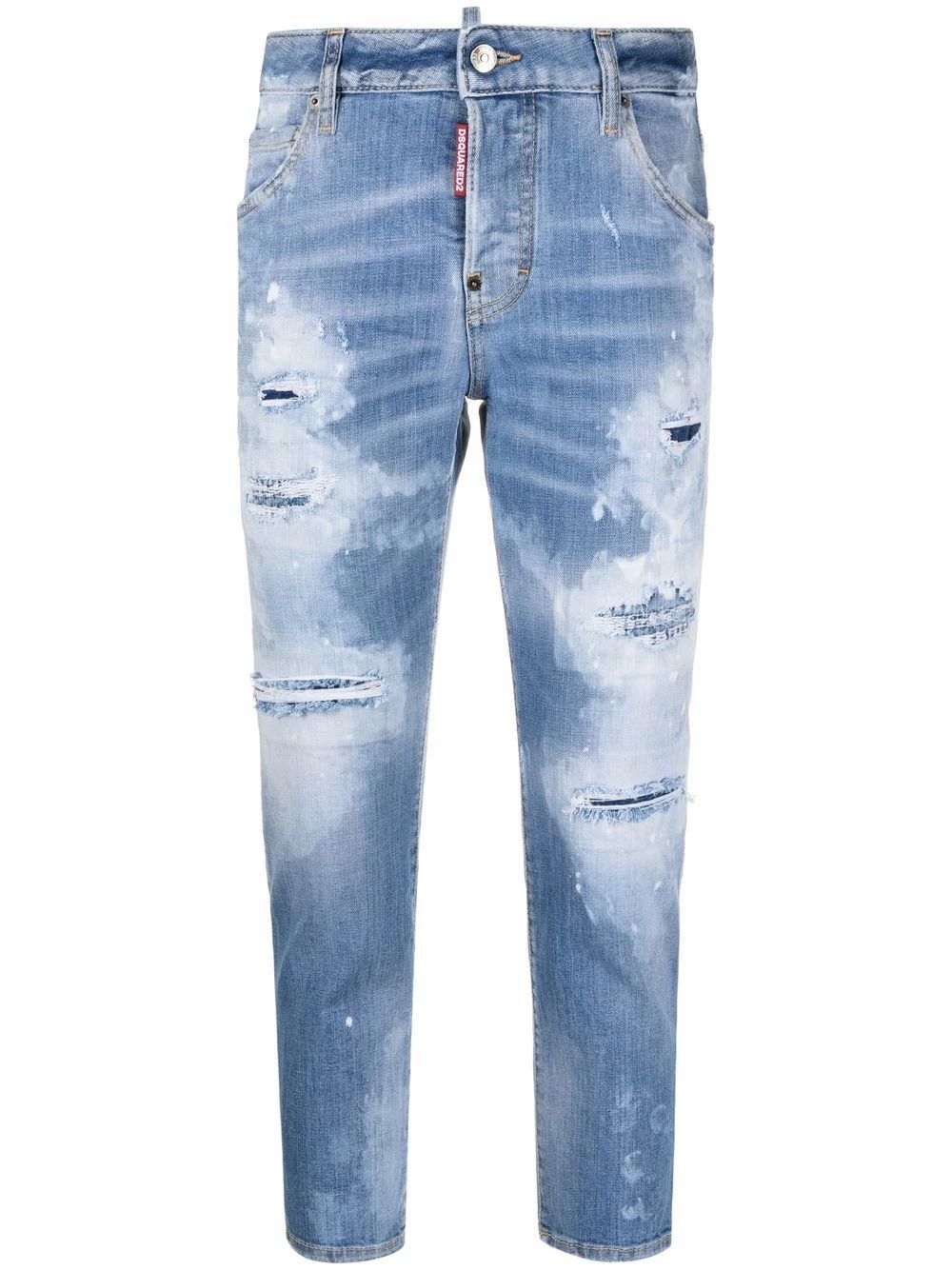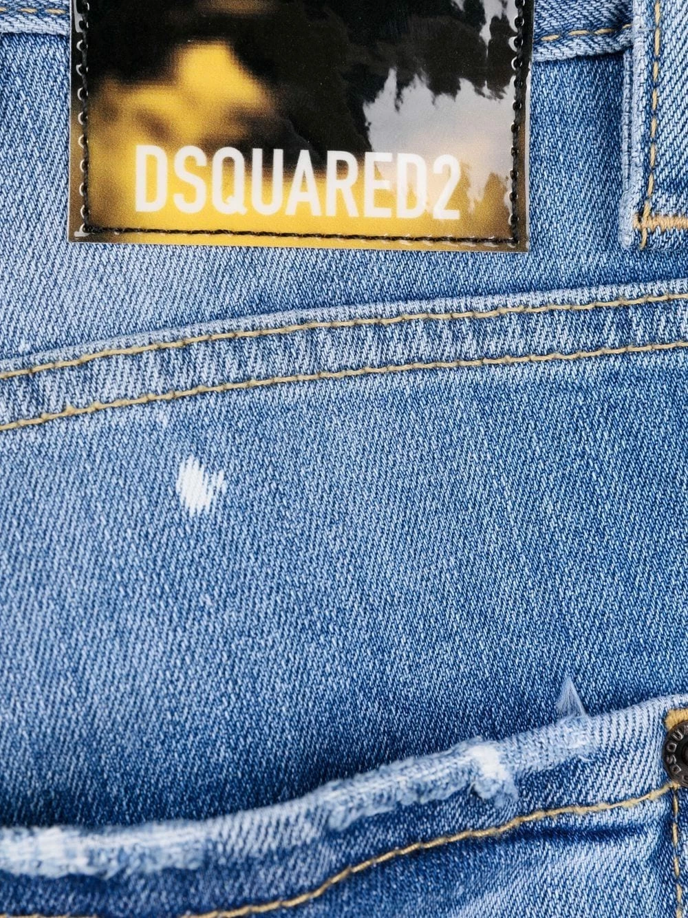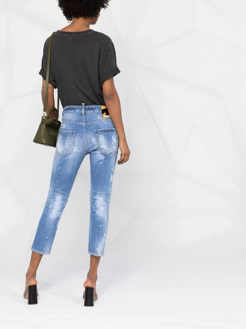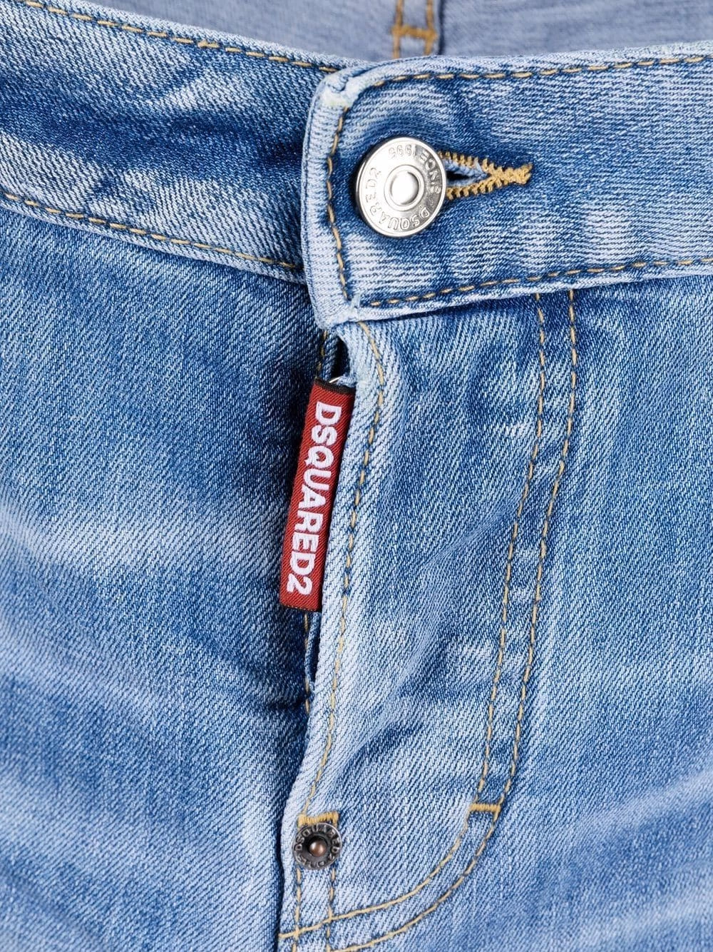Taille haute, cinq poches classiques, fermeture à zip et boutons sur le devant, effet usé, finitions effilochées, patch logo sur l’arrière, longueur crop.