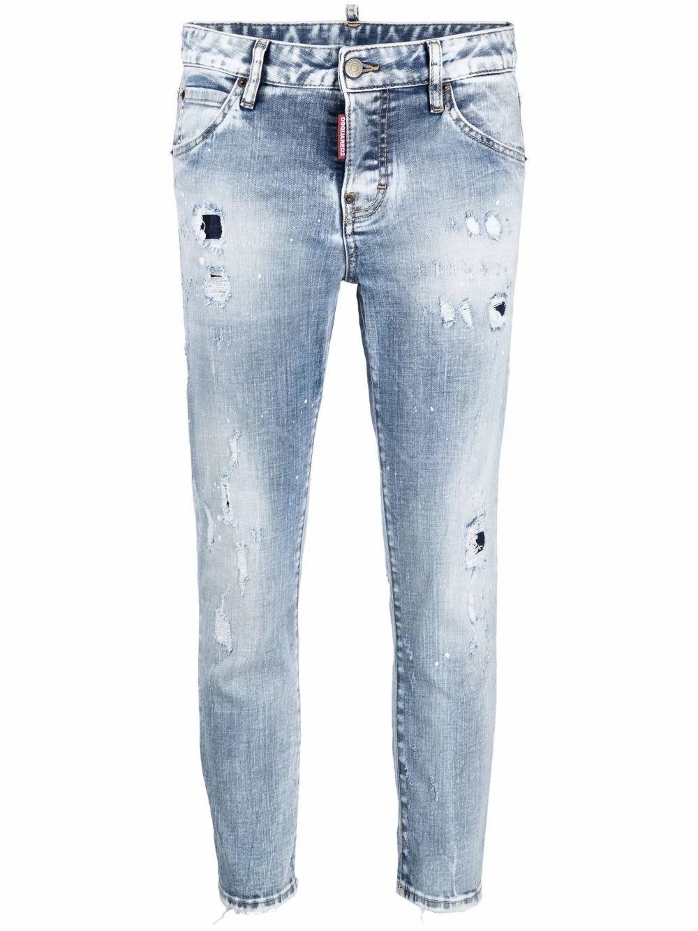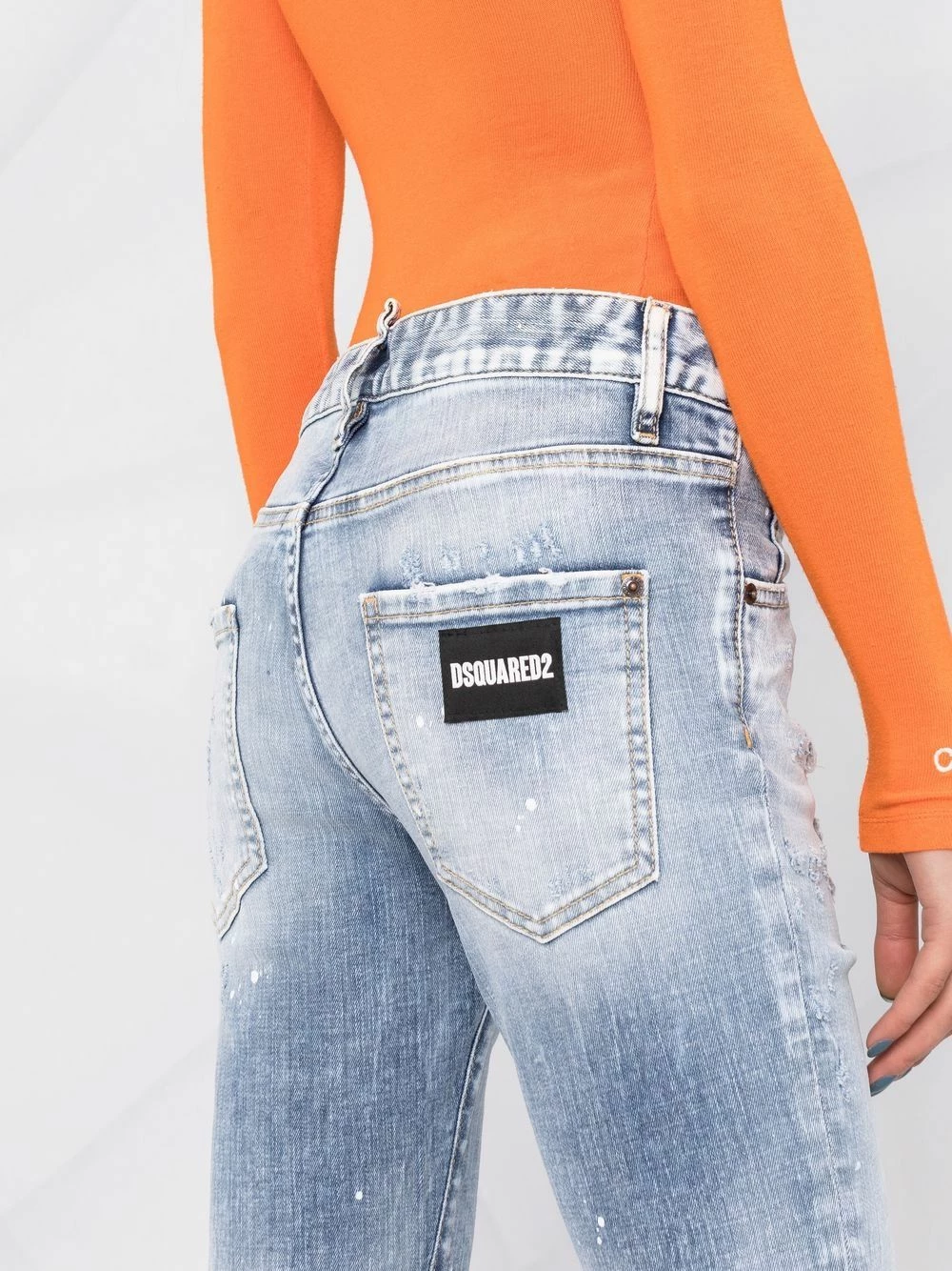 Finitions effilochées, taille basse, passants de ceinture, boutonnière sur le devant, cinq poches classiques, longueur crop. Couleur : bleu.