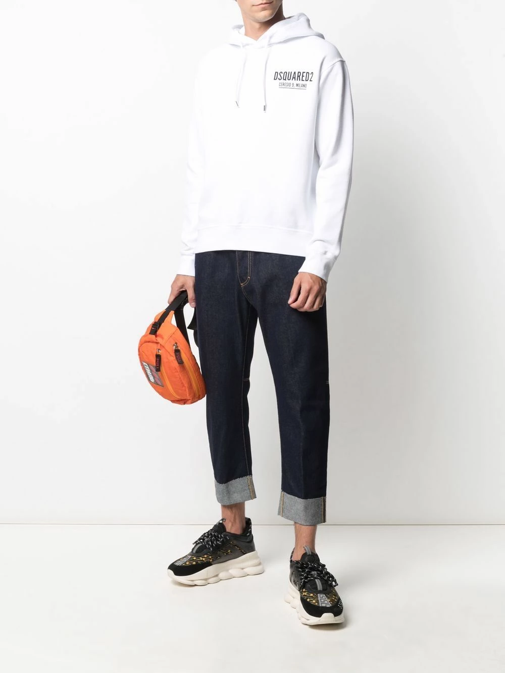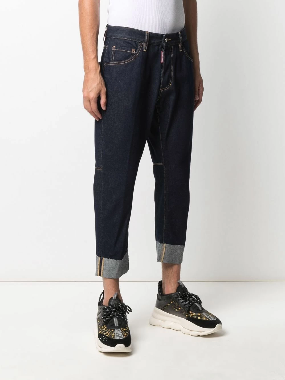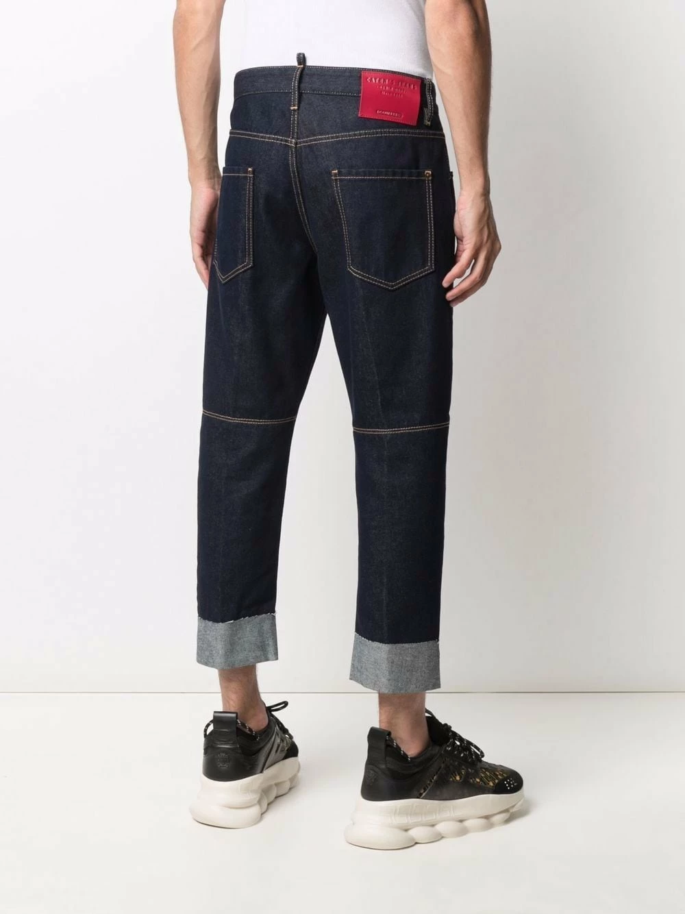 Coutures contrastantes, passants de ceinture, patch logo sur l’arrière, ourlet retroussé, longueur crop, fermeture à braguette dissimulée et bouton, cinq poches classiques. Matière : coton.