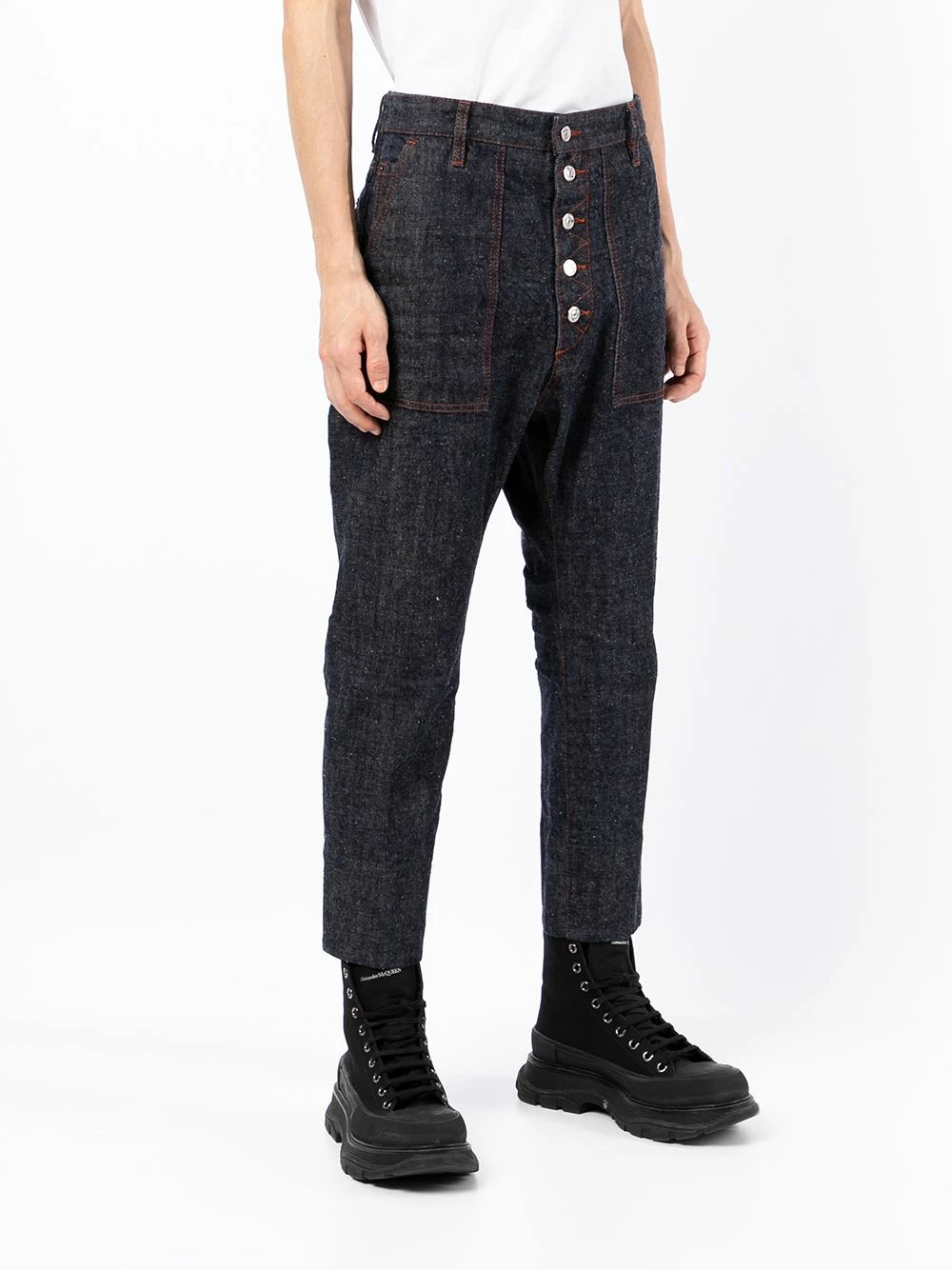 Taille mi-haute, boutonnière sur le devant, passants de ceinture, coupe fuselée, coupe courte. Matière : coton.