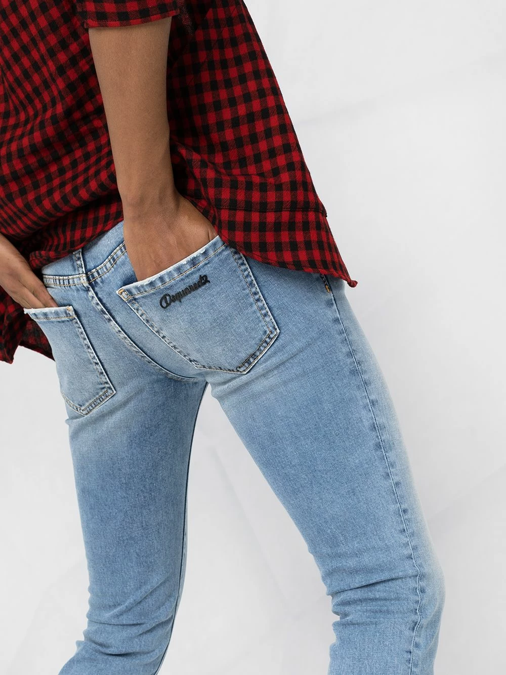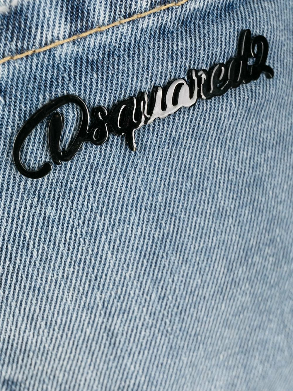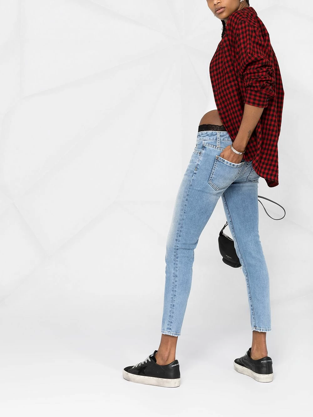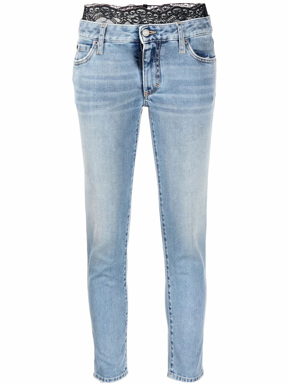 Détails en dentelle à fleurs, effet délavé, taille basse, boutonnière sur le devant, passants de ceinture, plaque logo, coupe courte.