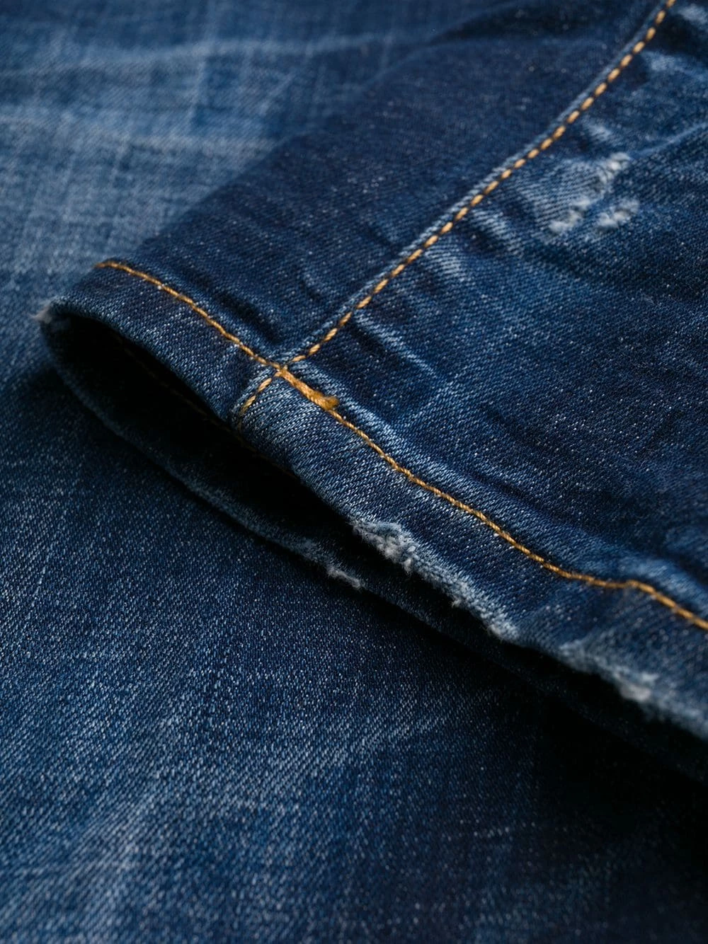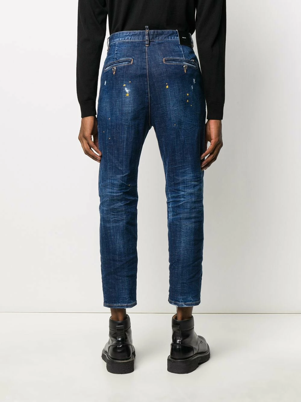 Jean crop à effet usé Dsquared2 avec effet délavé usé, longueur crop, fixation à boutons, passants de ceinture, poches arrière passepoilées et poches latérales. Couleur : bleu.