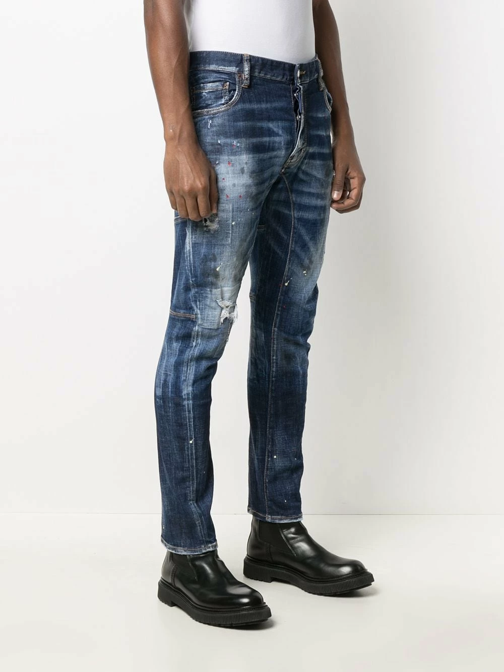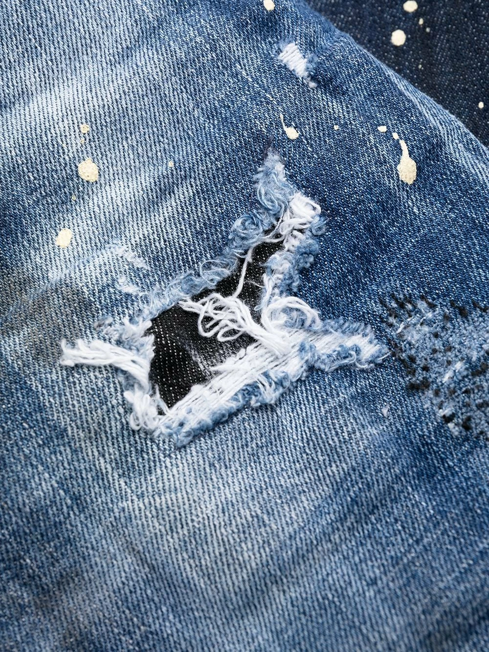 Finitions effilochées, effet taches de peinture, taille mi-haute, passants de ceinture, 5 poches classiques, coupe droite. Couleur : bleu.