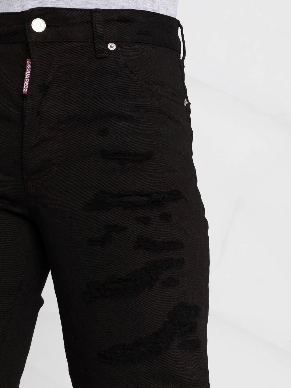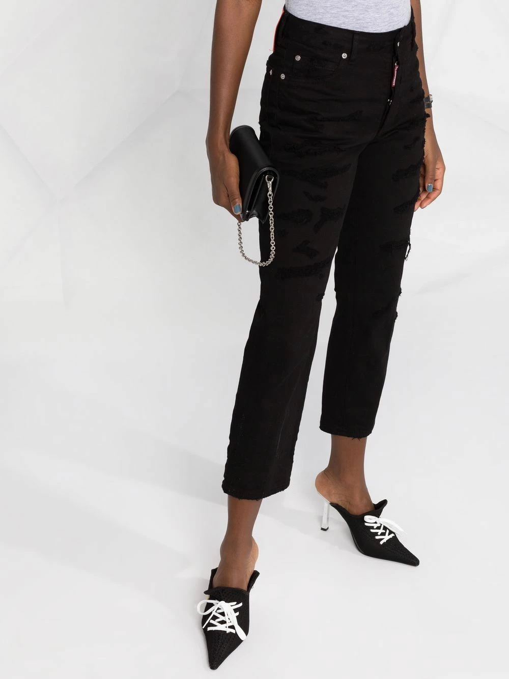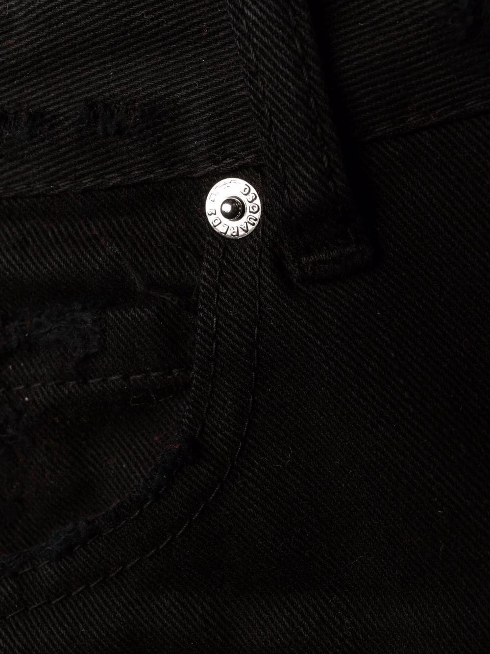 Finitions effilochées, patch logo sur l’arrière, étiquette logo, taille haute, cinq poches classiques, longueur mollet, coupe droite. Couleur : noir. Matière : coton.
