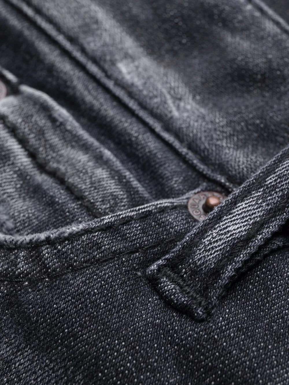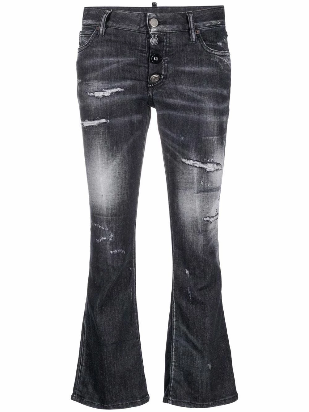 Finitions effilochées, finitions à effet usé, patch logo sur le devant, taille mi-haute, passants de ceinture, boutonnière sur le devant, ourlet évasé.