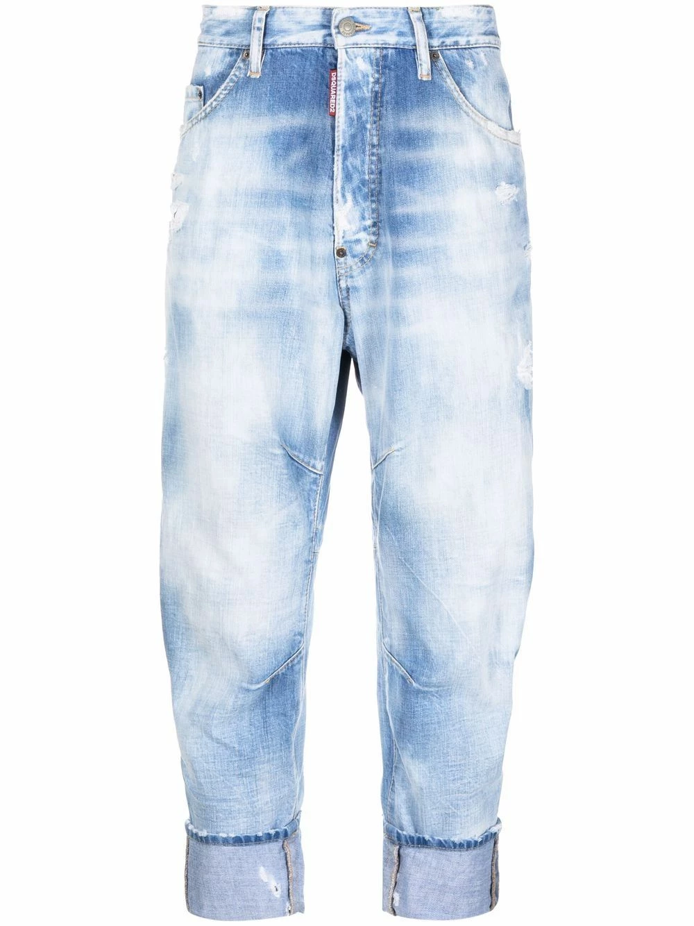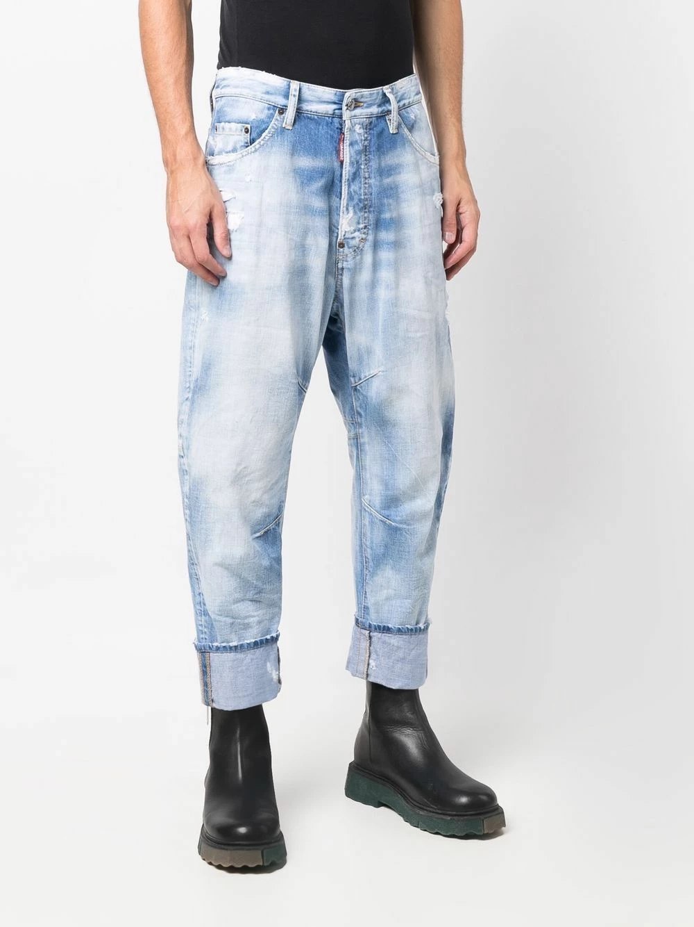 Denim délavé, effet délavé, passants de ceinture, fermeture à zip et boutons sur le devant, cinq poches classiques, coupe fuselée.