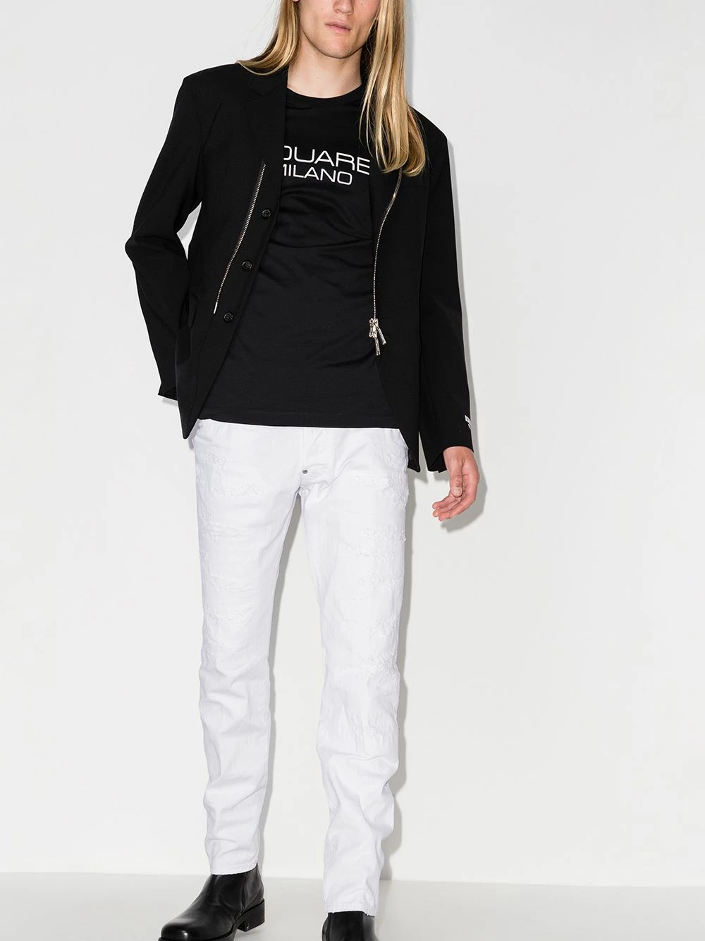 Coupe slim, taille mi-haute, fermeture à zip et boutons sur le devant, cinq poches classiques, passants de ceinture, patch logo sur l’arrière. Couleur : blanc. Matière : coton.