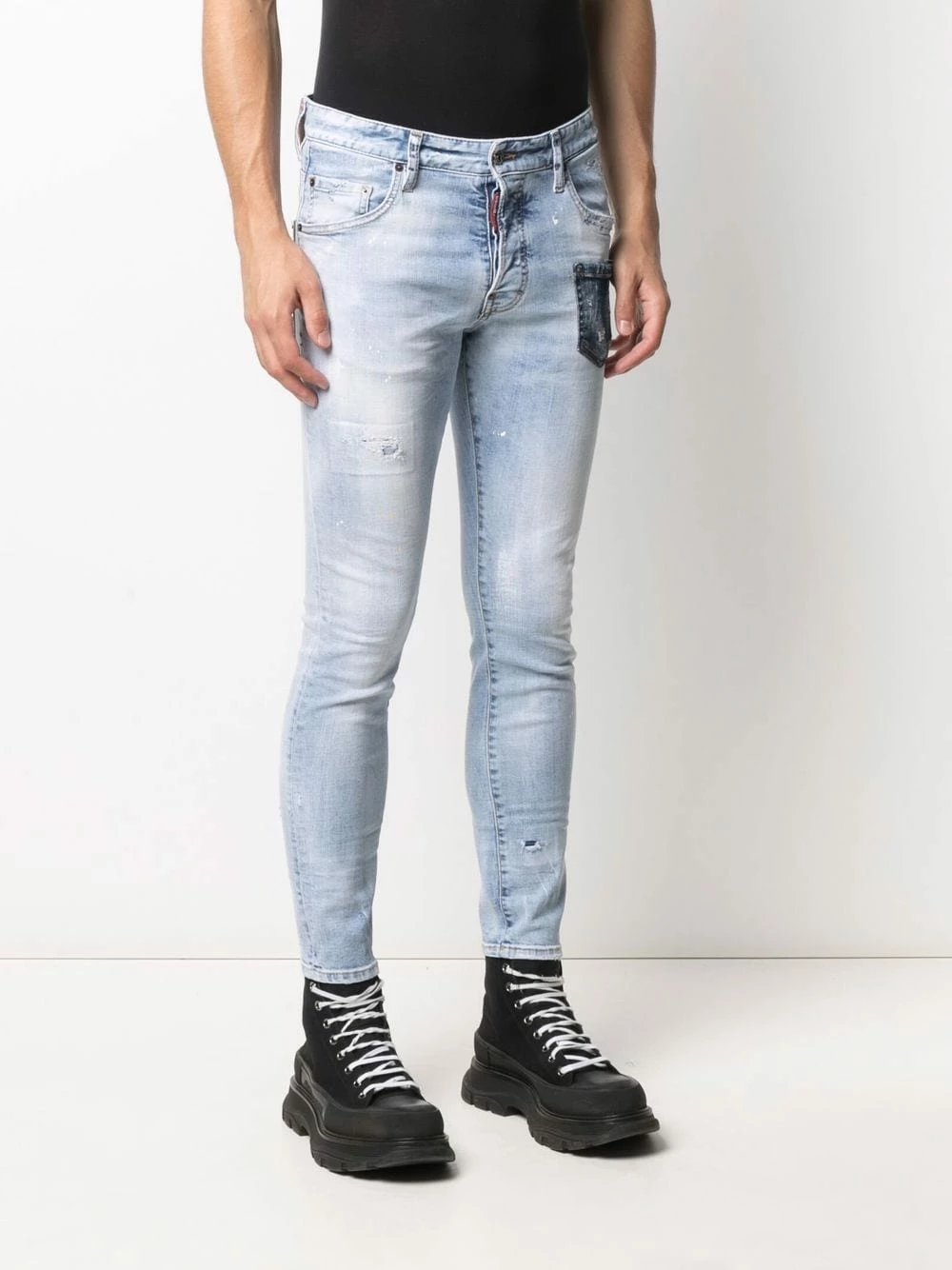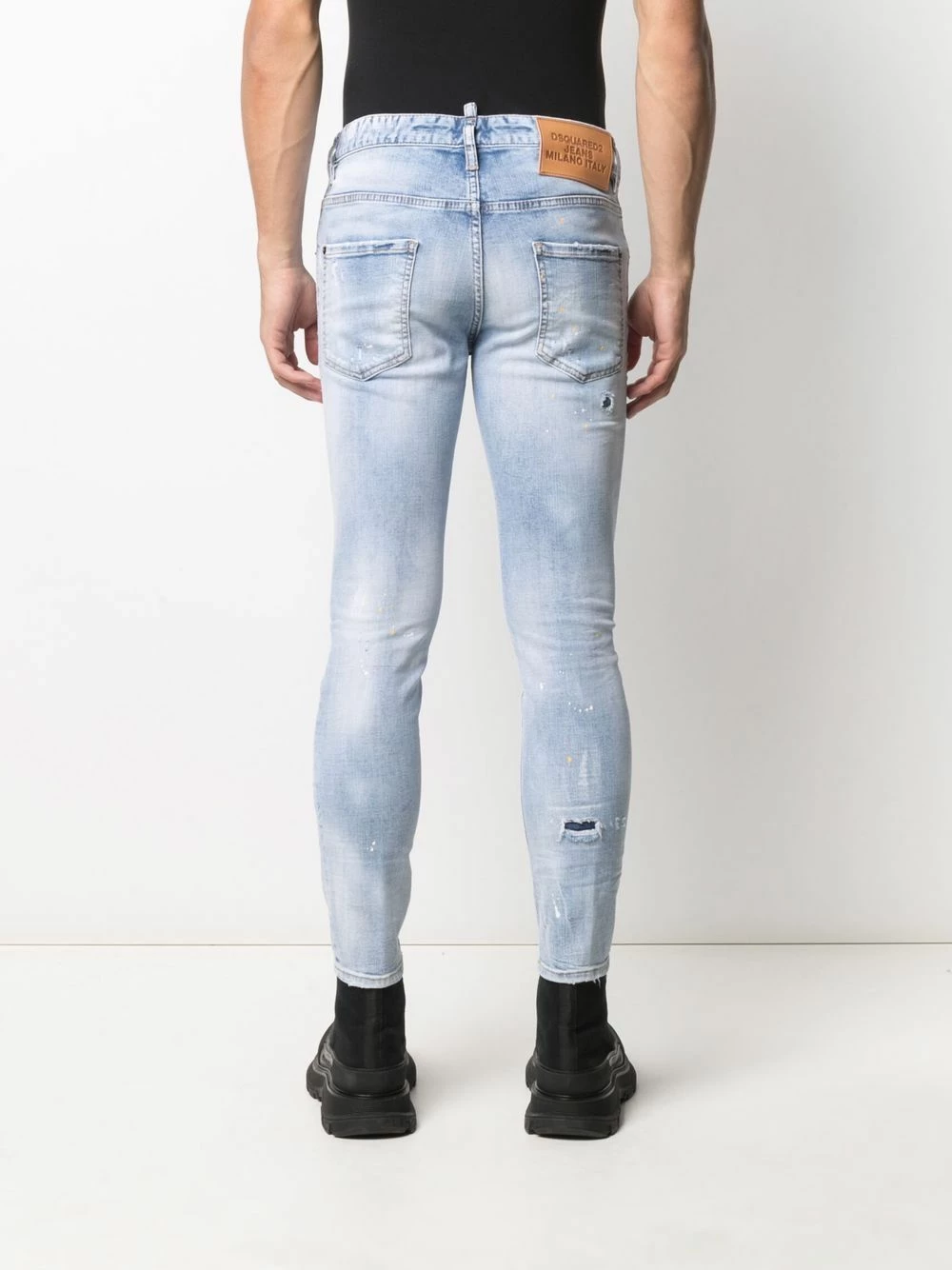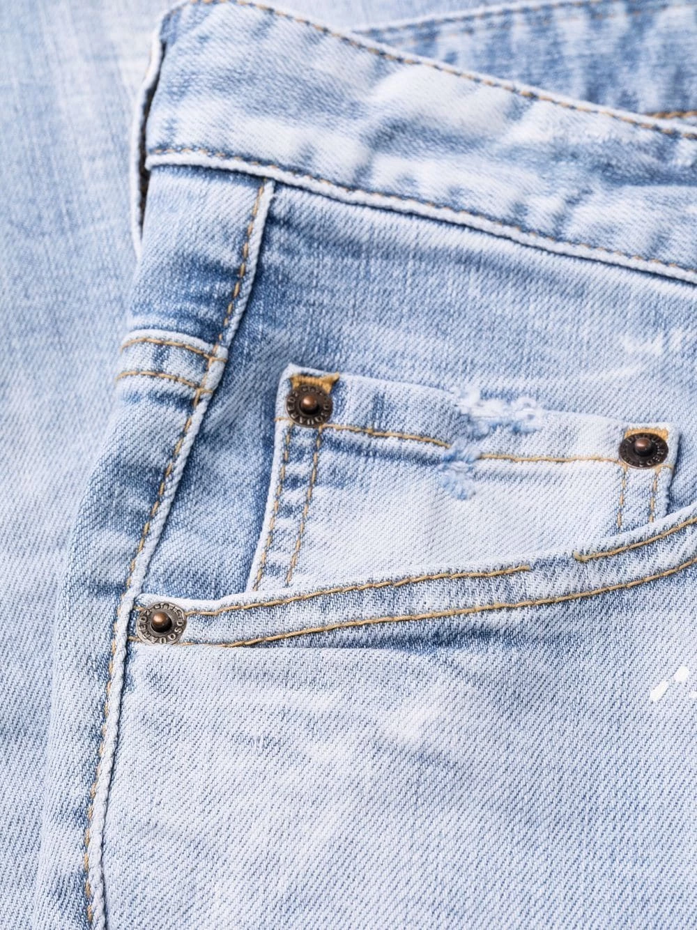 Taille mi-haute, passants de ceinture, fermeture à zip et boutons sur le devant, cinq poches classiques, coupe skinny, effet délavé.