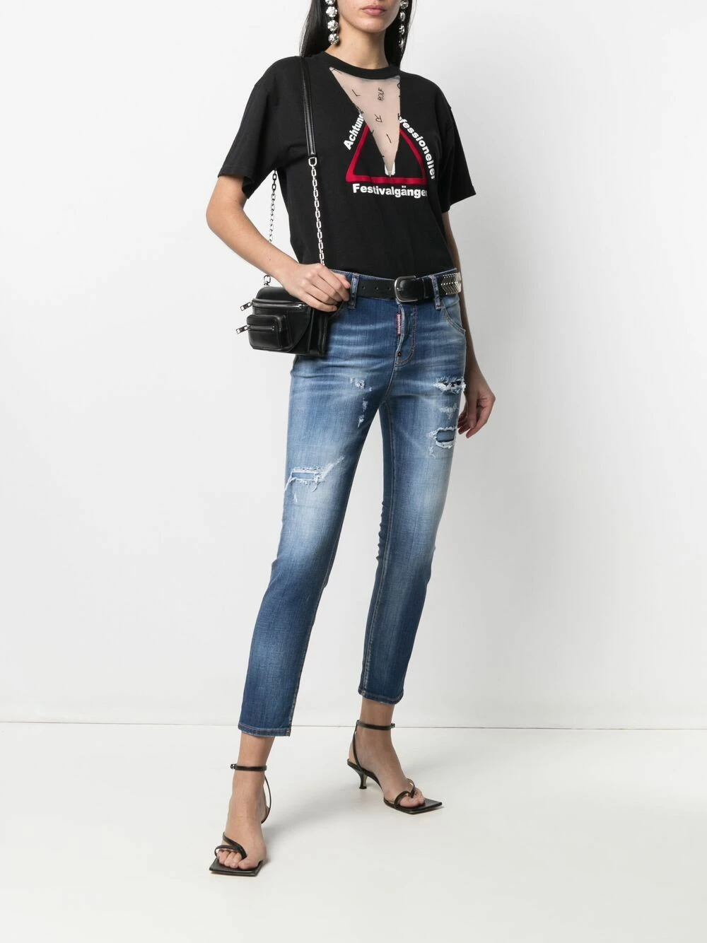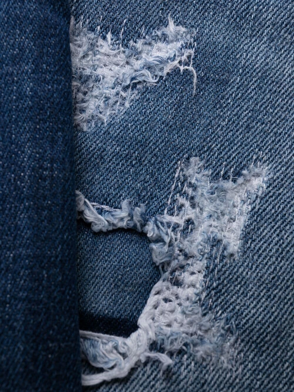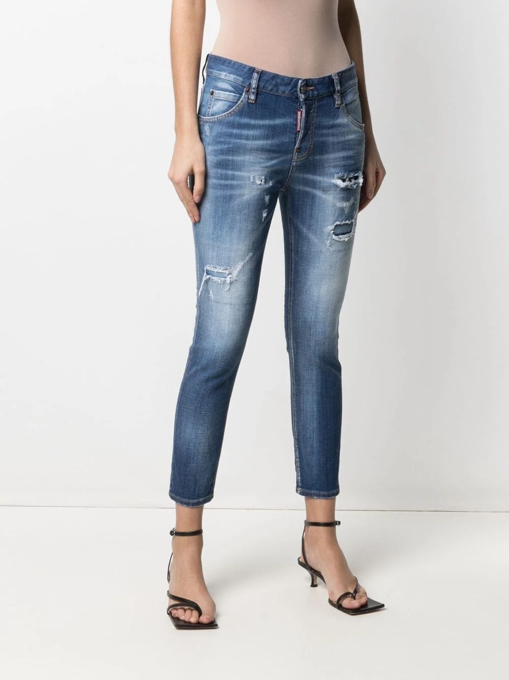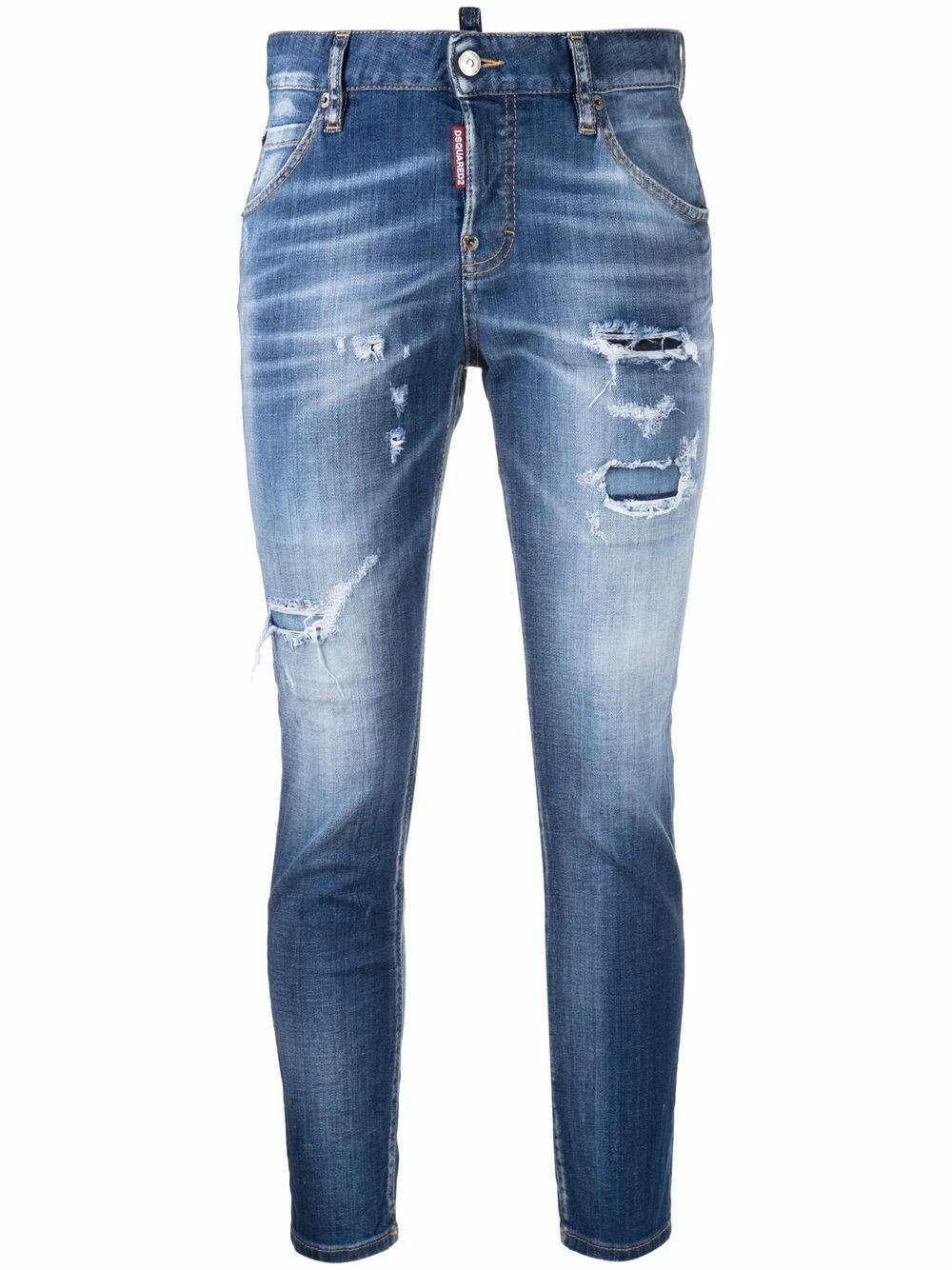 Effet délavé, finitions effilochées, taille mi-haute, passants de ceinture, boutonnière sur le devant, patch logo sur le devant, 5 poches classiques, patch logo sur l’arrière, coupe skinny, longueur crop. Couleur : bleu.