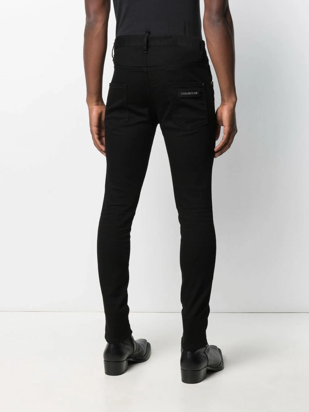 Taille mi-haute, cinq poches classiques, passants de ceinture, fermeture à zip et boutons sur le devant, patch logo sur l’arrière, coupe skinny. Couleur : noir.