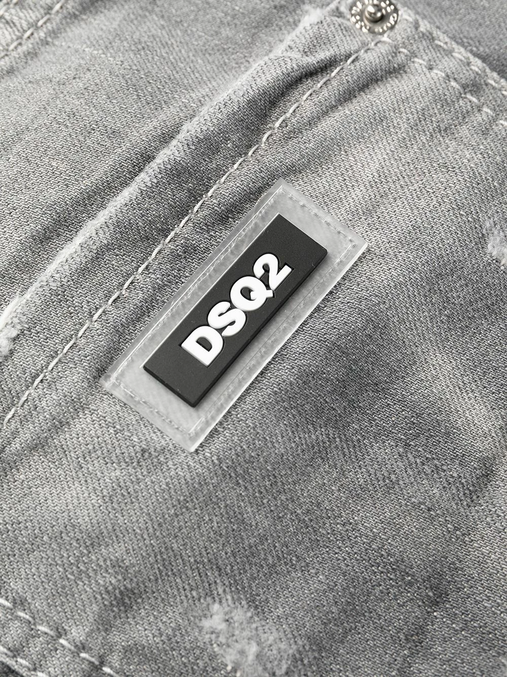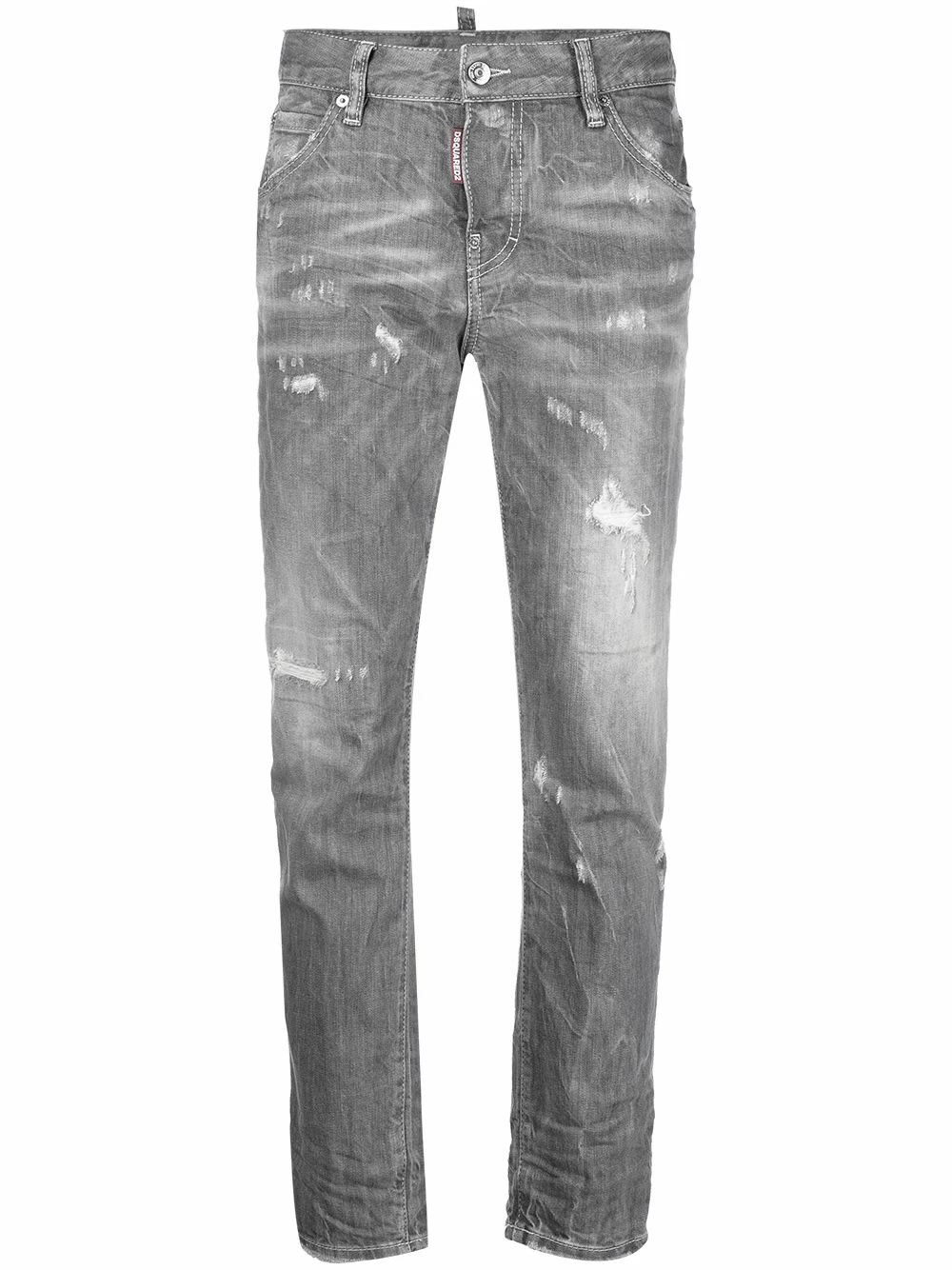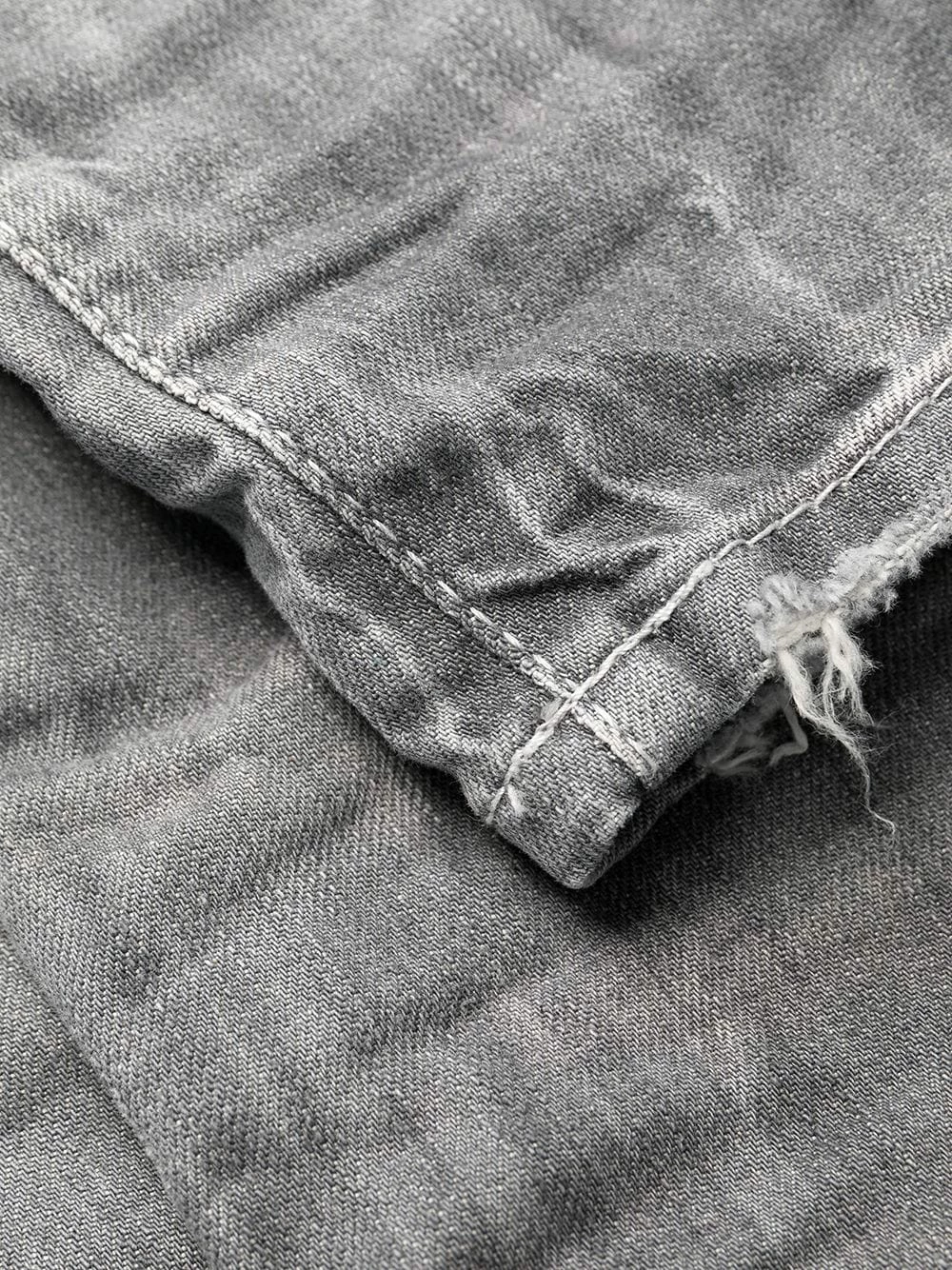 Effet usé, finitions effilochées, effet froissé, patch logo sur le devant, longueur crop, fermeture à zip et boutons sur le devant, 5 poches classiques. Couleur : gris. Matière : coton.