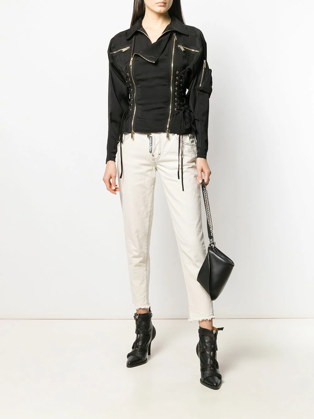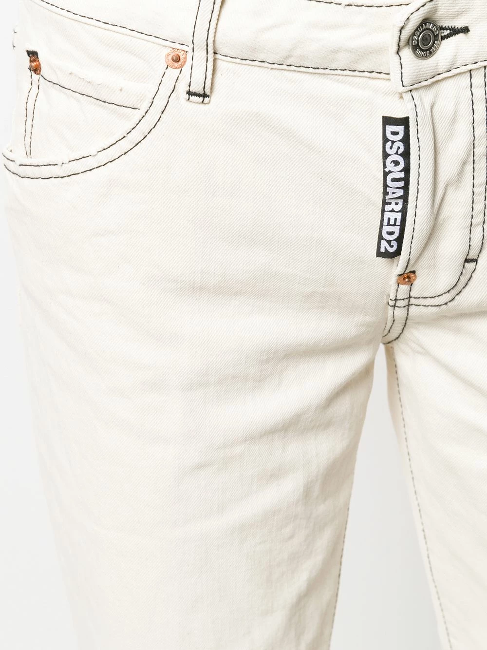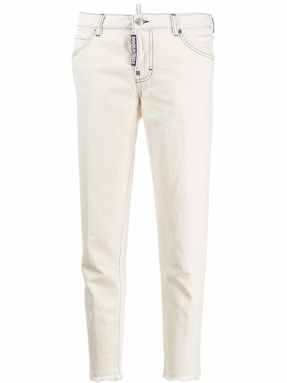 Jean slim à bords francs en coton Dsquared2 avec taille basse, passants de ceinture à la taille, bouton et zip, coupe classique cinq poches, détails de coutures et coupe crop.