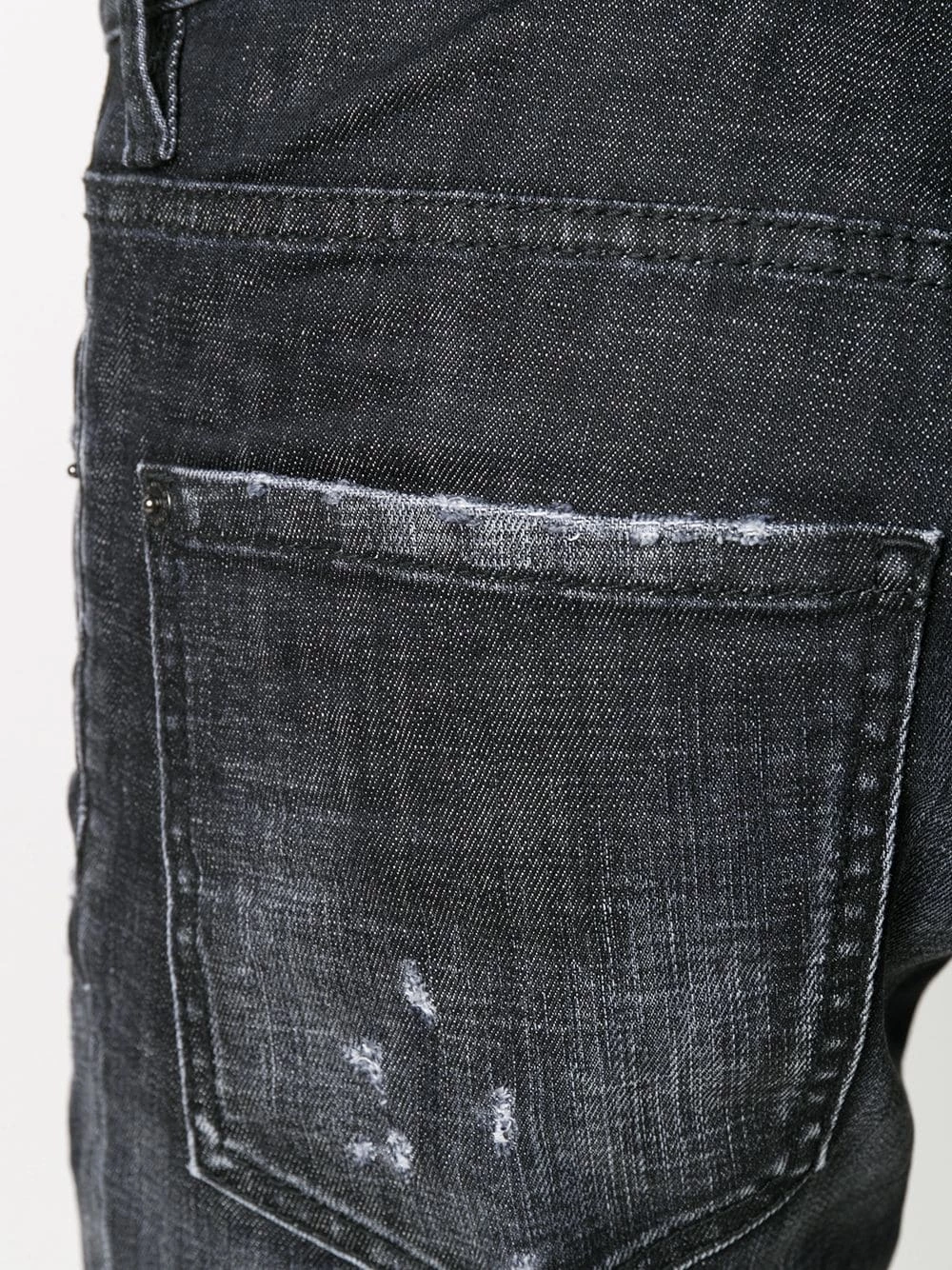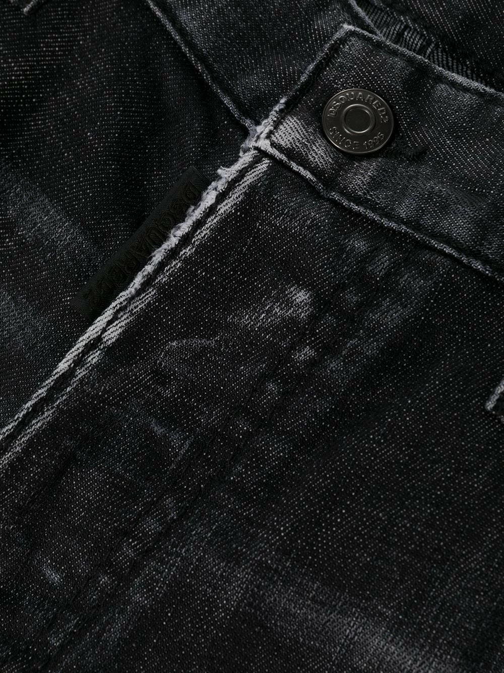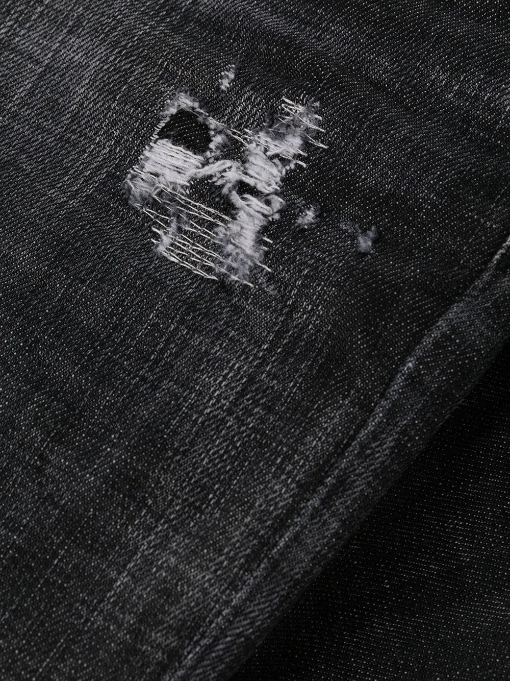 Fermeture boutonnée, passants de ceinture, 5 poches classiques, effet usé, finitions à effet usé, patch logo sur l’arrière. Couleur : noir.
