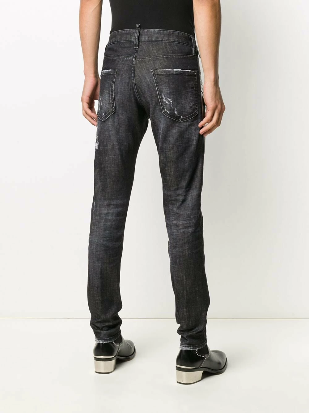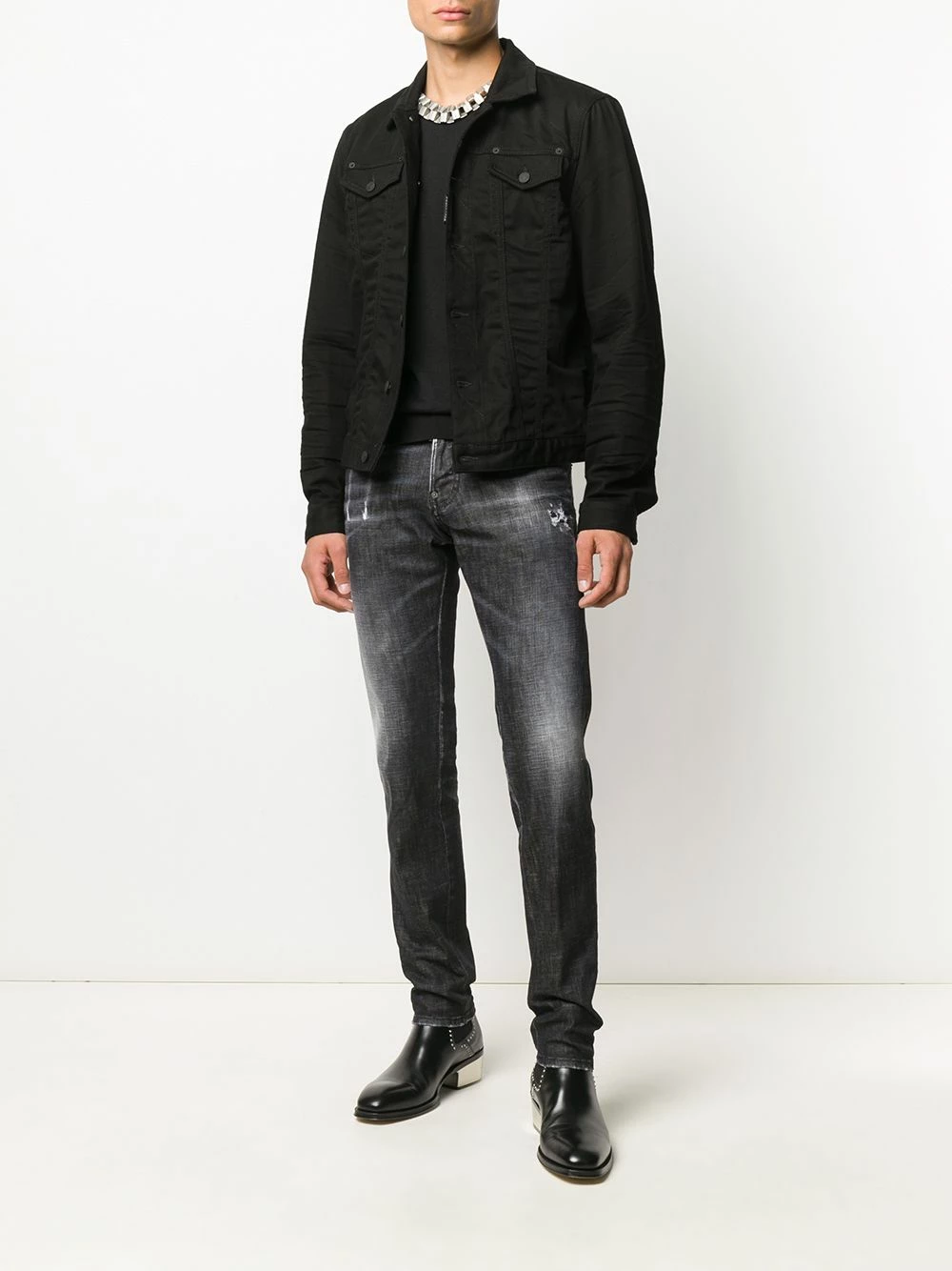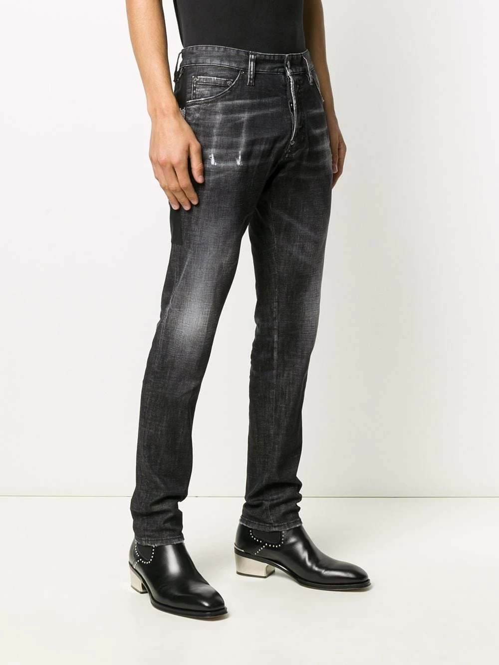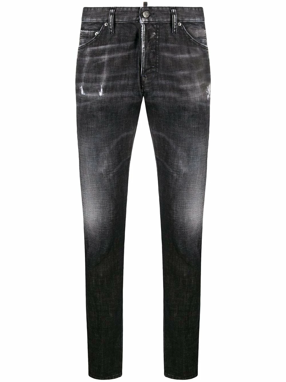 Fermeture boutonnée, passants de ceinture, 5 poches classiques, effet usé, finitions à effet usé, patch logo sur l’arrière. Couleur : noir.