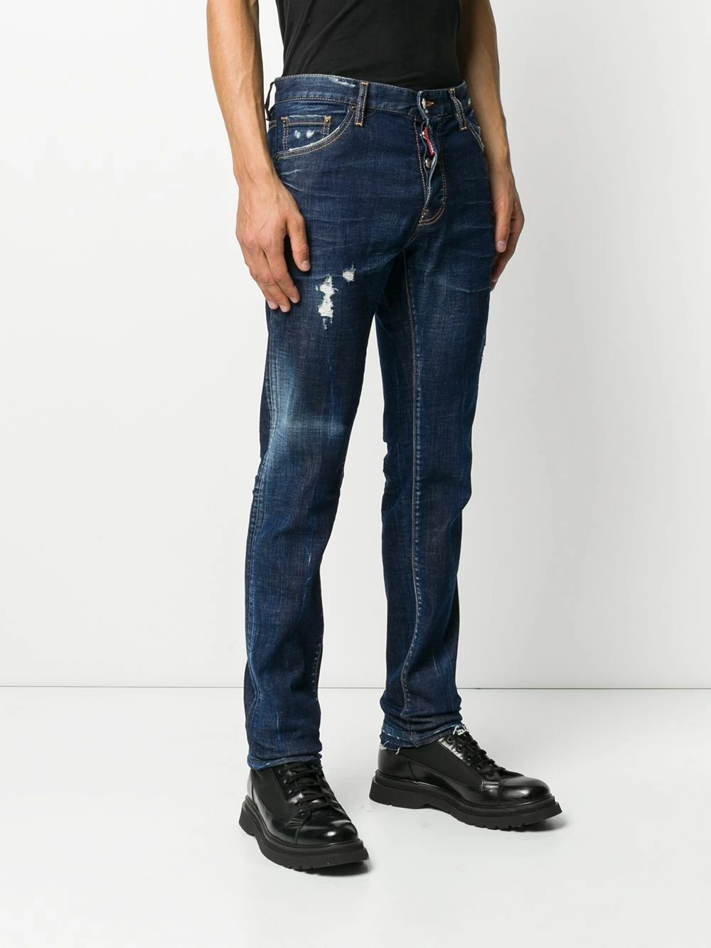 Passants de ceinture, patch logo sur l’arrière, fermeture à zip et boutons sur le devant, 5 poches classiques, finitions effilochées, coupe ajustée. Couleur : bleu.