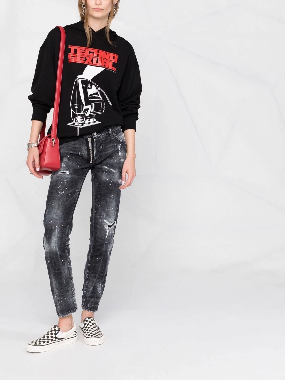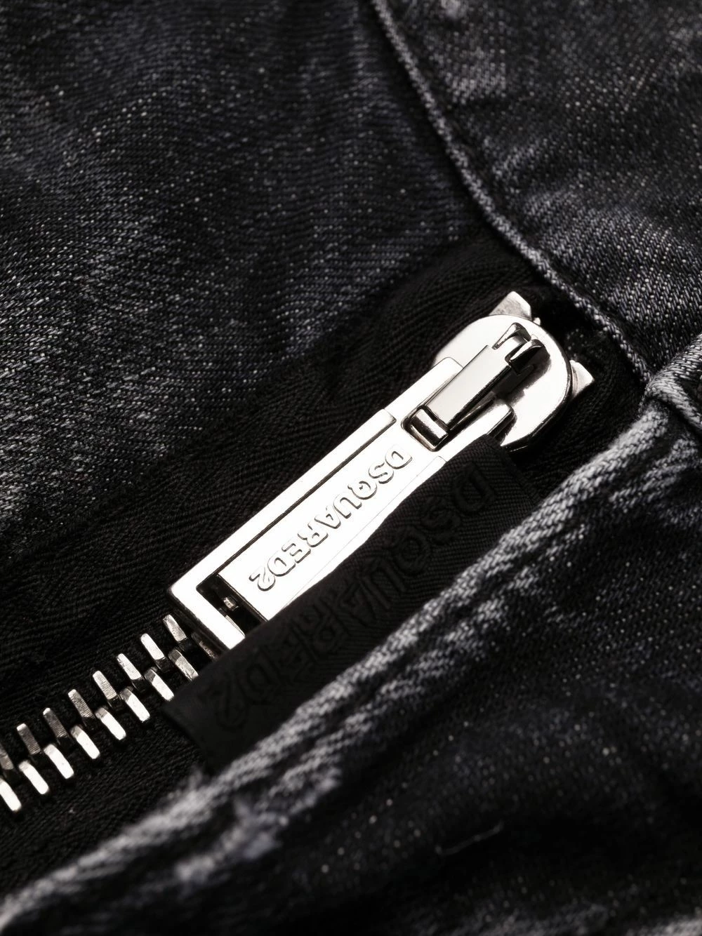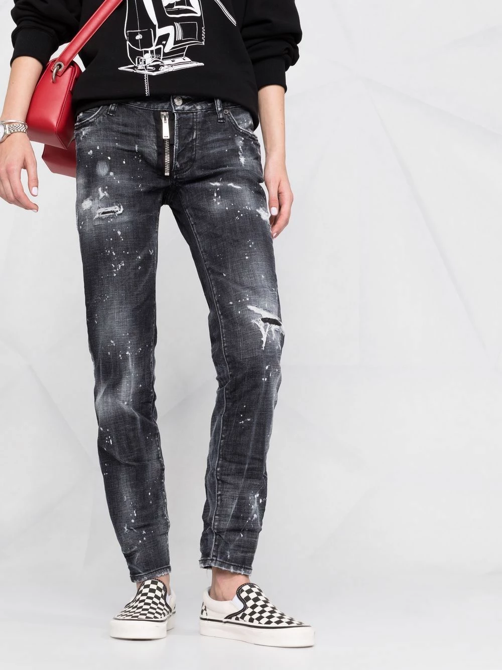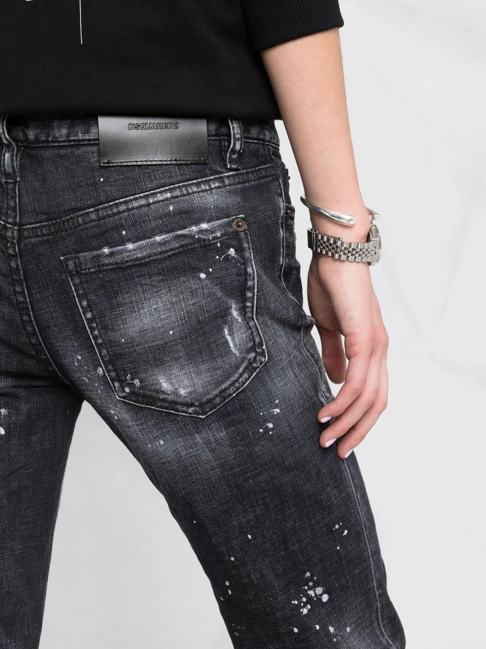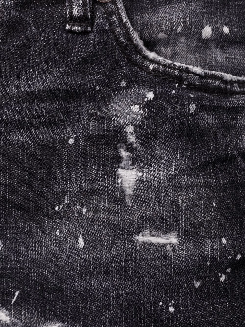 Effet taches de peinture, effet usé, taille basse, coupe slim, passants de ceinture, fermeture zippée, cinq poches classiques. Couleur : noir.