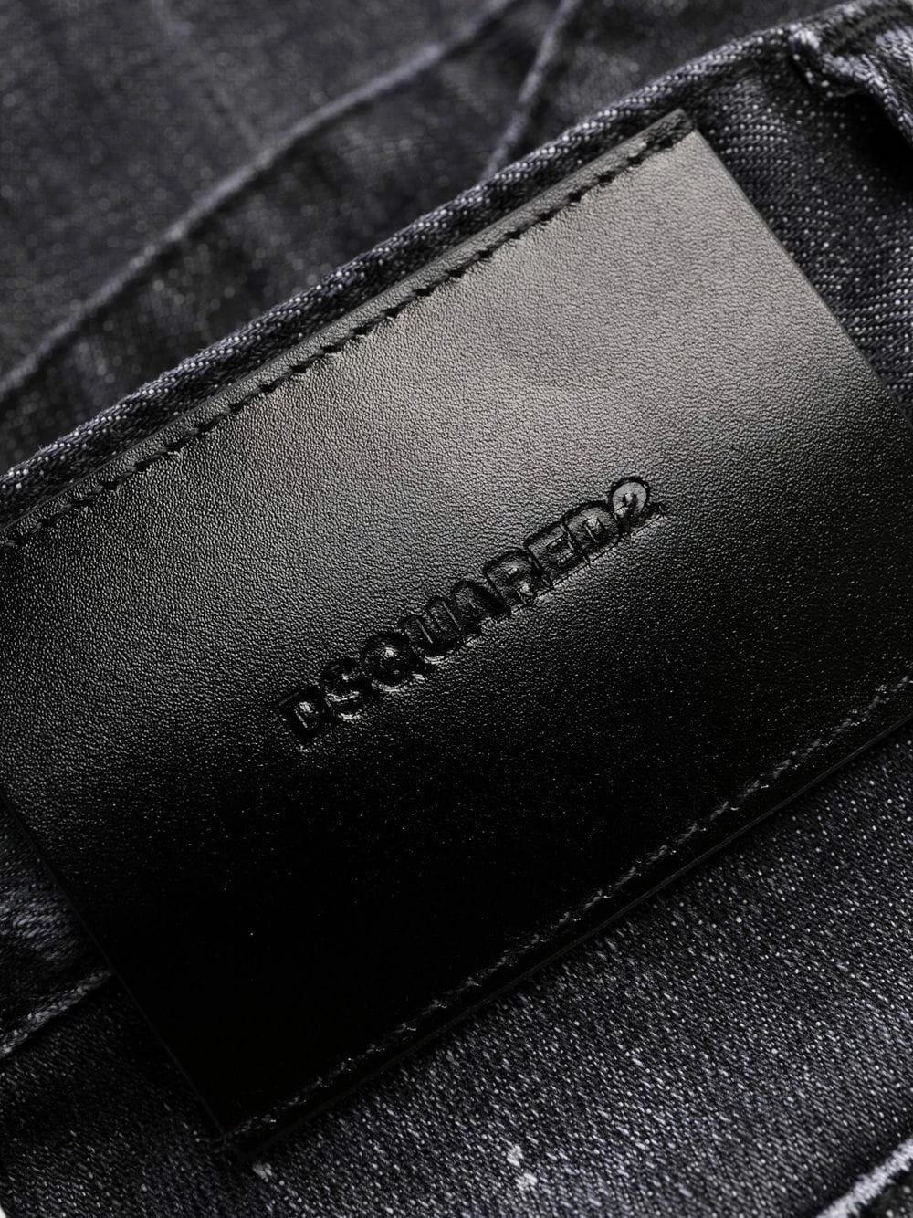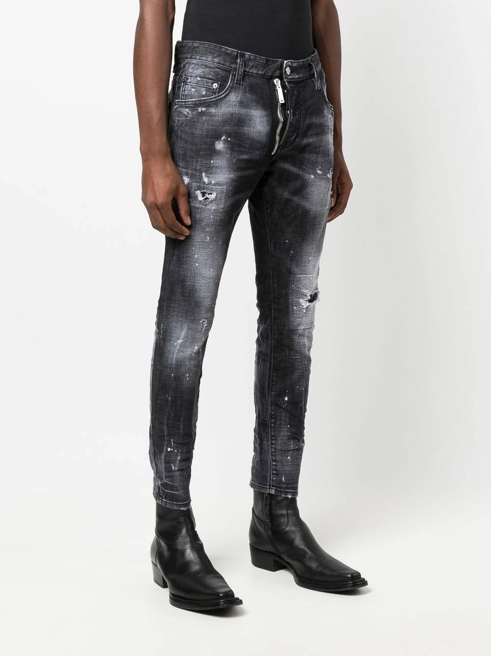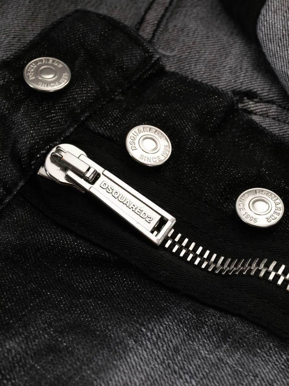Étiquette en cuir, teinture foncée, effet usé, détail de zip, taille mi-haute, coupe slim, fermeture boutonnée, cinq poches classiques.