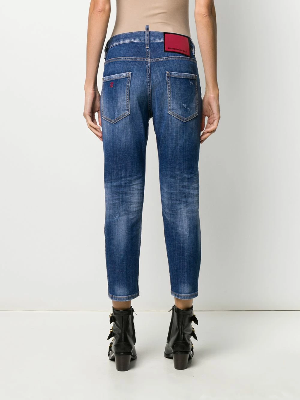 Jean slim I Love D2 Dsquared2 avec effet délavé, taille haute, passants de ceinture à la taille, boutonnière sur le devant, coupe classique cinq poches, patch à logo à l’arrière et coupe crop. Couleur : bleu.
