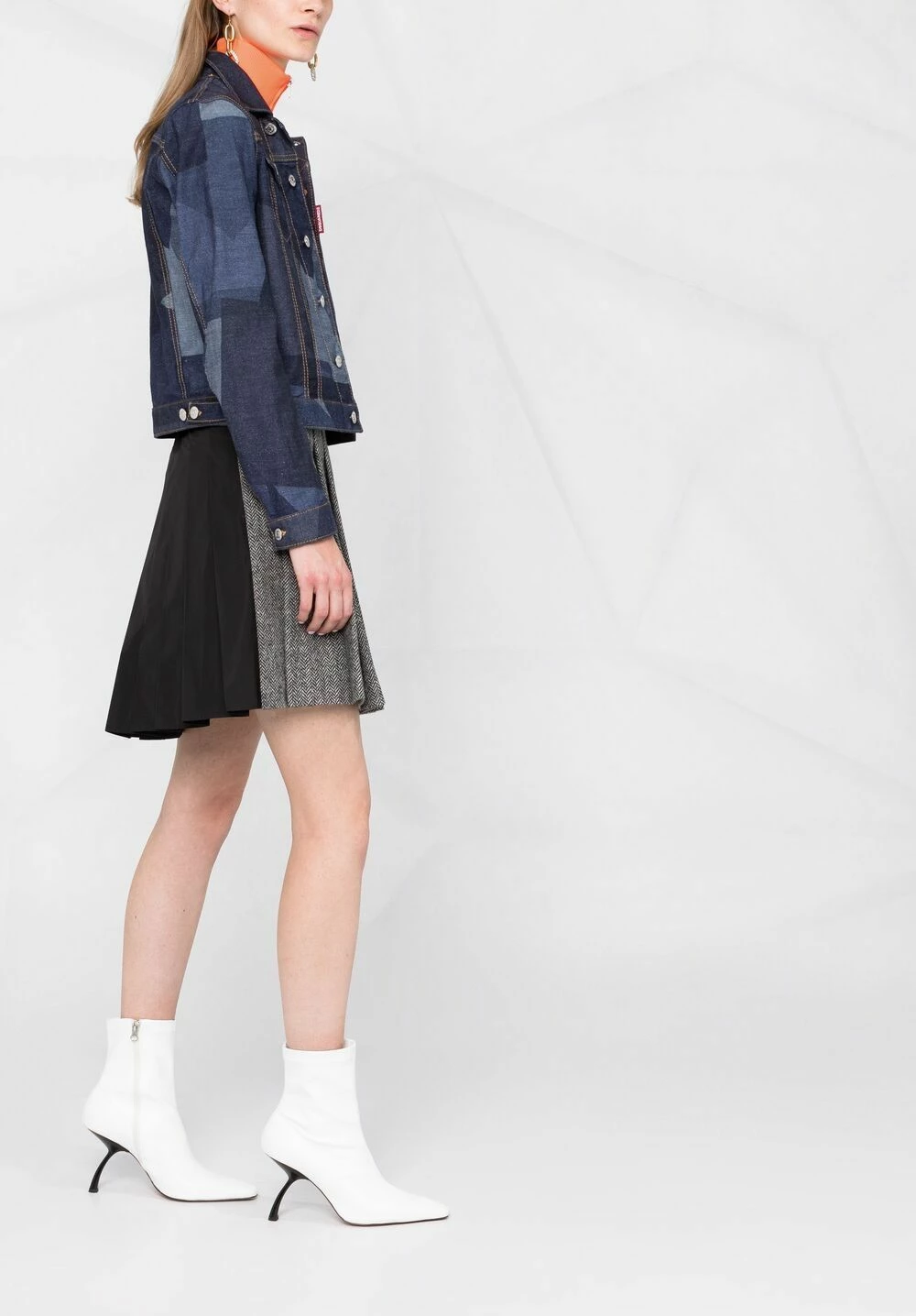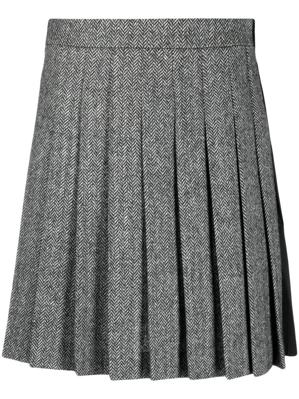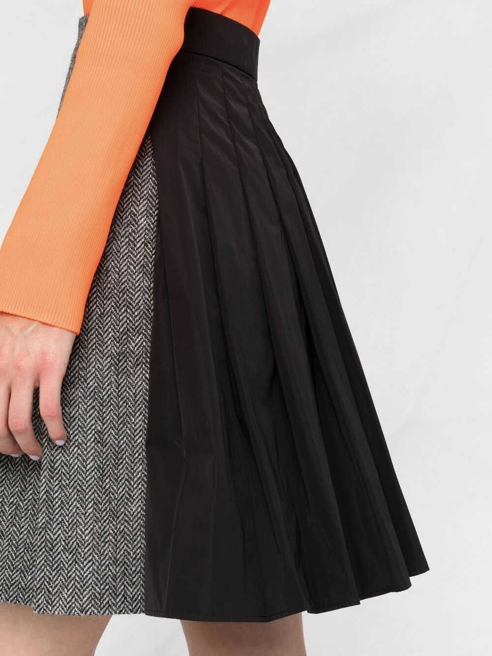 Motif de chevrons, modèle bicolore, design plissé, taille haute, fermeture zippée sur les côtés, coupe courte. Matière : laine.